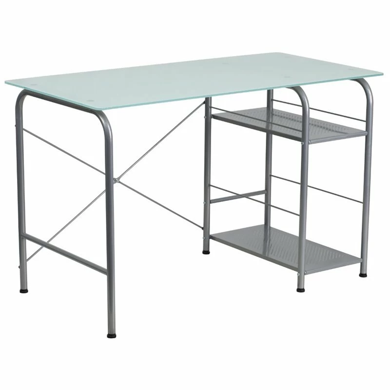 Give your workspace an open airy feel with this smartly designed computer desk where you can use your desktop or laptop and still have plenty of room for your writing materials and accessories. This computer desk features a spacious rectangular glass work surface and open storage for your CPU and other materials. A silk white tempered glass surface complements the silver powder coated frame finish. Investing in a desk for your home makes working from home or managing household bills and paperwork a nicer experience.