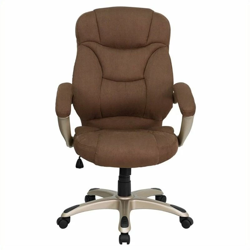 This gracefully designed chair features brown microfiber upholstery to comfortably get you through your work day or to keep you comfortable while browsing the internet. This chair features an ergonomically contoured back and seat and arms that are comfortably padded. High back office chairs extend to the upper back for greater support and relieve tension in the lower back, preventing long term strain. The contoured seat dissipates pressure points for greater comfort. The waterfall front seat edge removes pressure from the lower legs and improves circulation. The tilt lock mechanism rocks/tilts the chair and locks in an upright position while the tilt tension adjustment knob adjusts the chair’s backward tilt resistance. Chair easily swivels 360 degrees to get the maximum use of your workspace without strain. The pneumatic adjustment lever will allow you to easily adjust the seat to your desired height. The gold nylon base with black caps prevents feet from slipping when resting on chairs base.