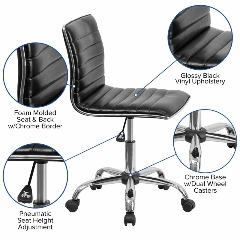 The Ribbed Task Chair will bring a trendy, modern look to your home or office. Armless chairs lend an upscale, designer feel to the conference or board room or your home office. The streamlined silhouette allows more room for members and guests while the armless design lets you roll further under your desk or table to get closer to your monitor or paperwork, without having to lean forward, preventing back strain. Upholstered in glossy vinyl with a chrome border, this chair features a low back design with a foam molded swivel seat and back. A pneumatic seat height adjustment lever lets you easily position the chair where you need it for the task at hand. This sturdy chair has a heavy duty, chrome base with dual wheel casters that make it easy to roll across the floor when you need to. This Low Back Designer Armless Black Ribbed Swivel Task Chair is a great choice for your reception desk, conference room or home office.