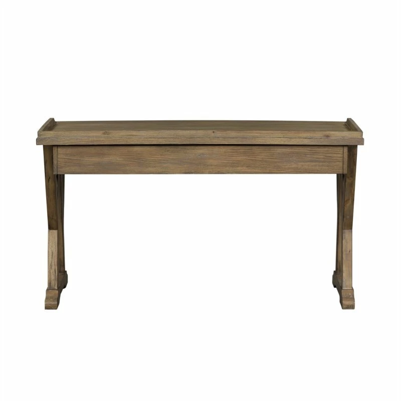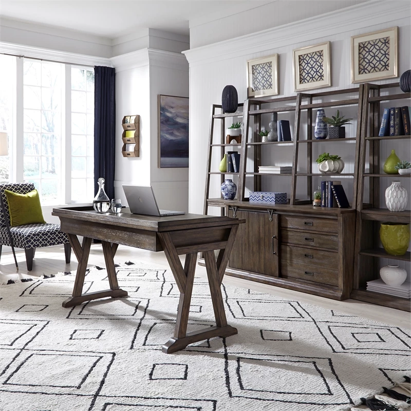 Create a look all your own with the Stone Brook lift top writing desk. Crafted of acacia and poplar solids with white oak veneers, this piece features a weathered gray finish. This desk has one full extension drawer that includes a flip-down keyboard tray and is accented with a recessed pull in an antique pewter finish. The gallery top can lift and extend from 30.5” to 38.5” high allowing for the option to stand while you work. The angled leg design offers style and stability. Create a look all your own with the Saddle Brook lift top writing desk.