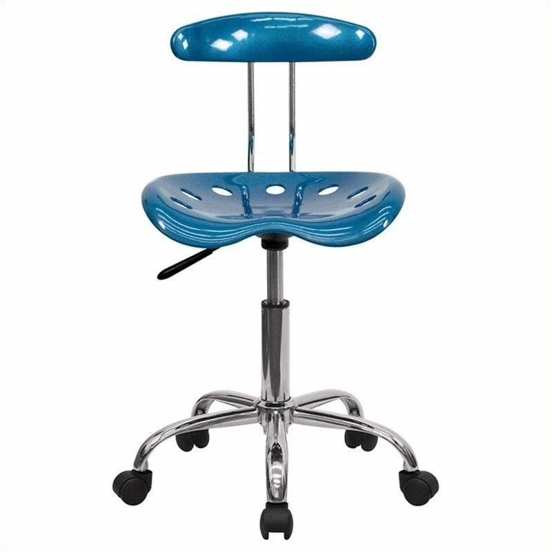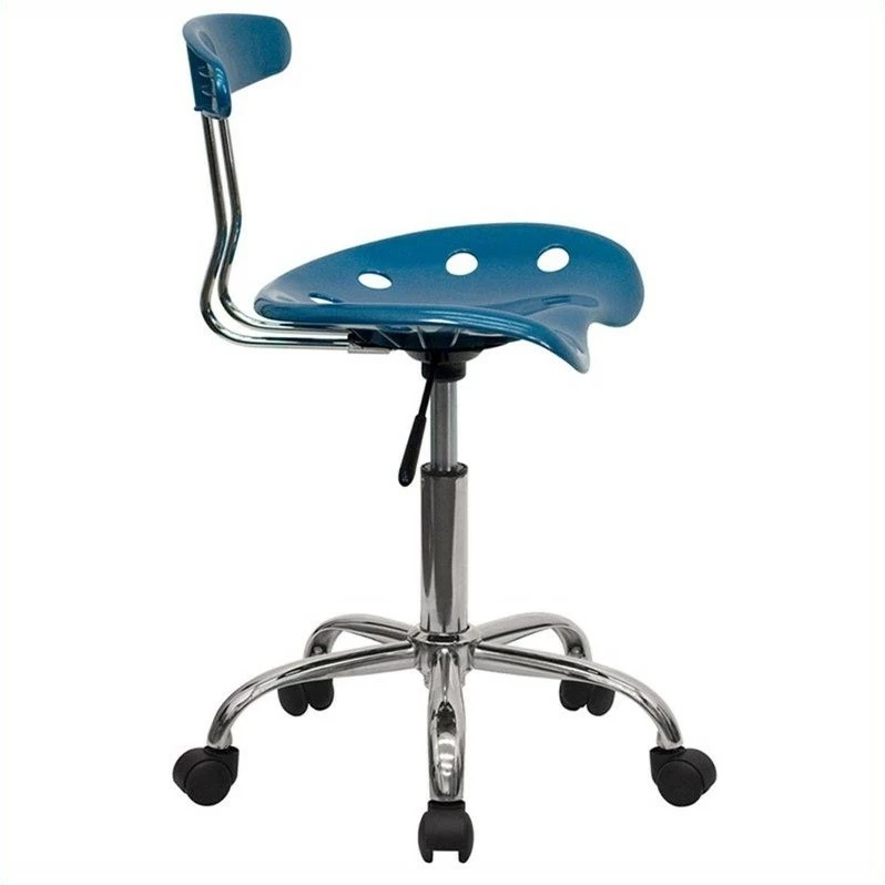 Change up the look in your home office with this colorful vibrant bright blue task chair. The molded tractor seat offers a tremendous amount of comfort and can be cleaned with a solvent and water based cleaner such as foam. Chair rotates 360 degrees to provide easy access to a greater range of area. The pneumatic adjustment lever will allow you to easily adjust the seat to your desired height. Dual wheel casters provide ease of movement around the space. The small frame of this chair will not take up a lot of space if working in a small area.