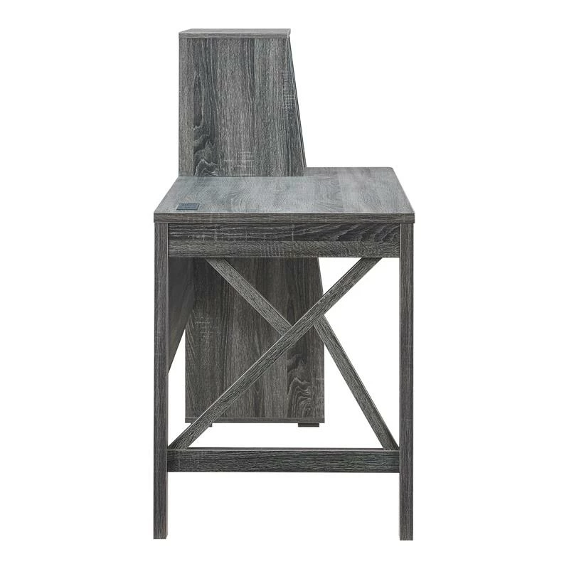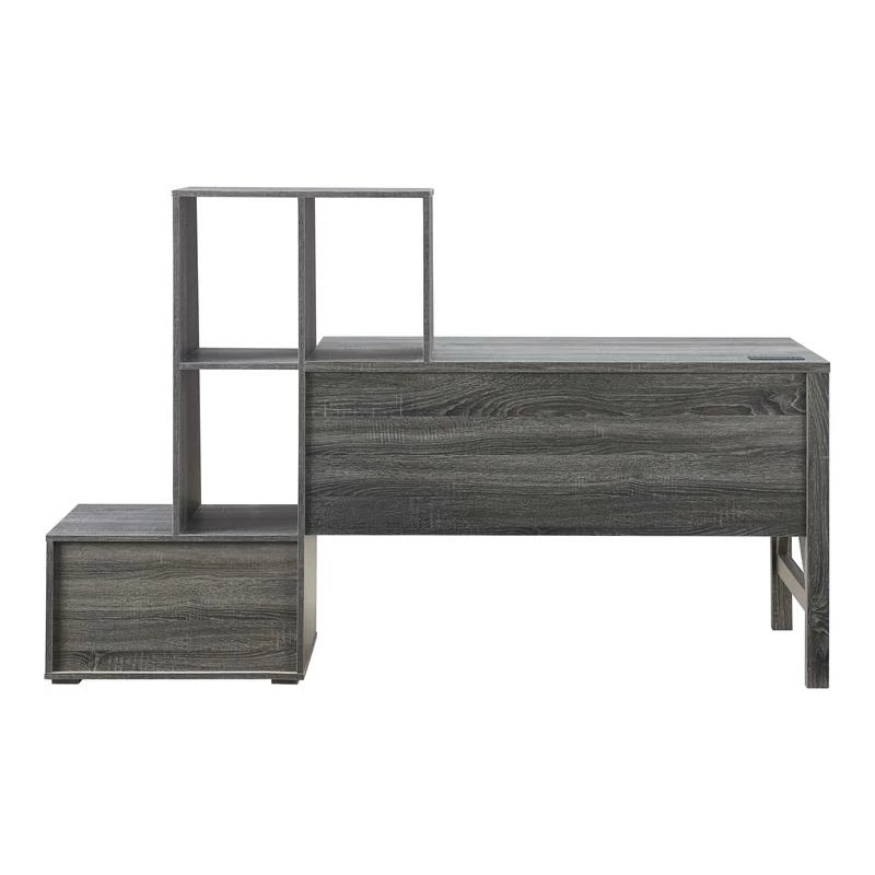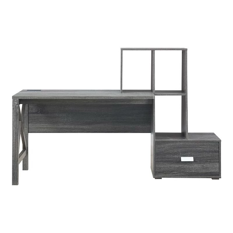 Dimensional in all the best ways, this contemporary wood desk in distressed gray is sure to become the centerpiece of your at-home workstation or study spot. Crossing accents add detail to an open side, while multiple shelves and one large drawer create a stepped effect on the other. A power station sits at the back edge of the desk to ensure easy access for your laptop, smart phone or tablet.