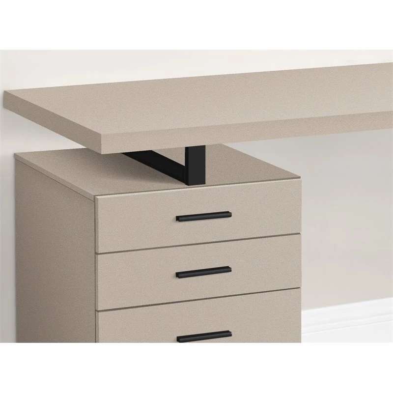 Maximize your home office space and your productivity with this computer desk with 3 storage drawers. The thick-panel floating desktop provides room for the essentials you need to work and allows you to use the top of the drawer unit as an extra surface. Finished in the same modern taupe laminate as the desktop, the drawer unit includes 2 small drawers and 1 large drawer with a bar for hanging files and offers space for items you want to keep off the work surface. The drawer unit is reversible and can be installed on the left or right side according to your preference. Supporting the desk is a metal leg in a black finish with a modern, stylish U shape.