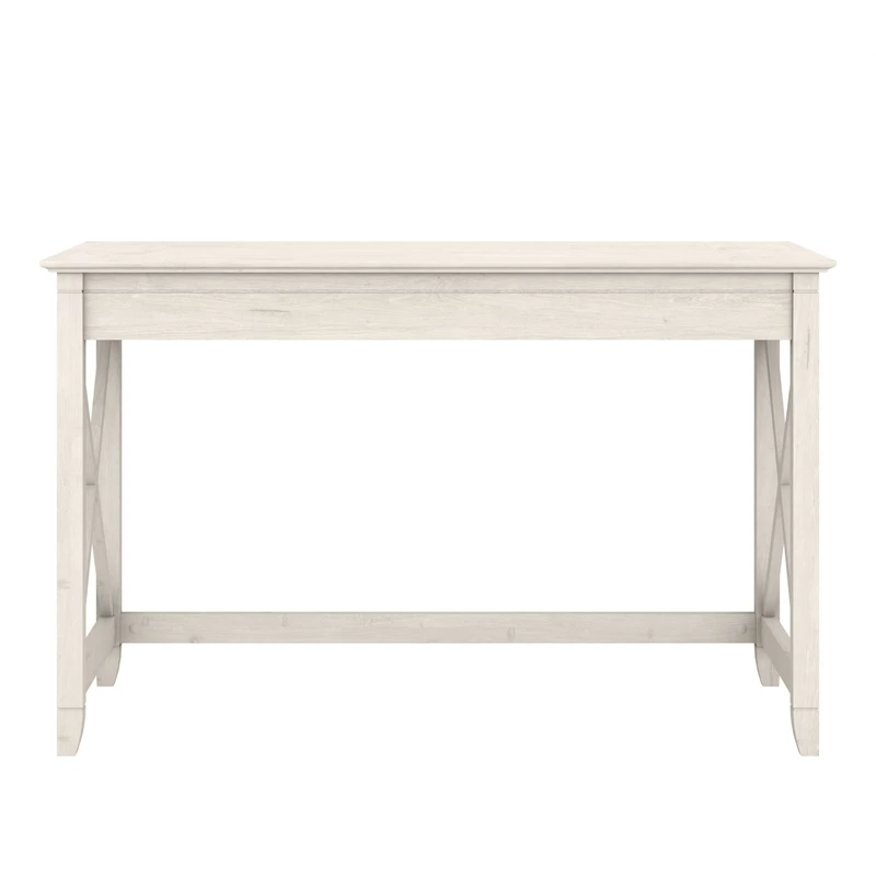 Take on your daily tasks from the comfort of a spacious personal work area, even in small office environments. The Pemberly Row 48W Writing Desk offers more than enough room to spread out with a laptop and paperwork as you surf the web, pay bills or check the mail. Featuring side panels with unique X pattern accents, this office desk creates a relaxed and airy style supported by a sturdy and attractive post leg design. The durable work surface has a weight capacity of 200 pounds so you can confidently keep books and other work materials close by. Measuring 48W x 24D x 30H, the Writing Desk is perfect for use as a sofa table, console table or personal work area and is finished on all sides to look great facing any direction. This small computer desk is tested to meet ANSI/SOHO quality standards for safety.