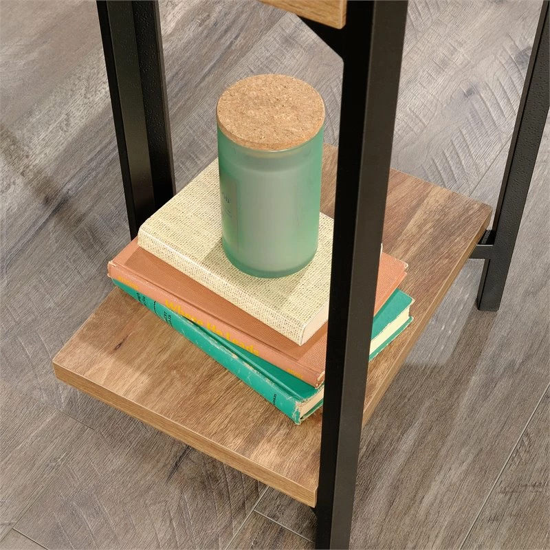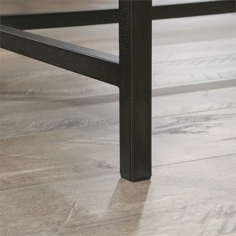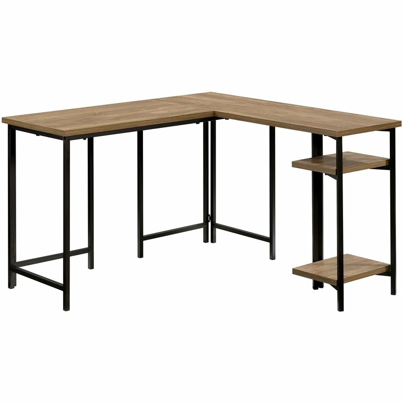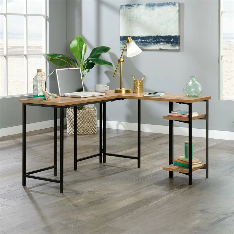 Looking to update your home office space? We can help! Create the home office of your dreams when you add the industrial-inspired style and functional design of this modern L-shaped desk from the Pemberly Row. This metal and wood desk offers a spacious top surface that provides you with all the room you need for different items like your laptop, stacks of folders, notepads and even a little home decor too. The fixed open shelves provide you with more easy access storage and display. It’s finished on all sides for versatile placement throughout any room in your home. Finished in Sindoori Mango and detailed with a durable, black metal frame, this attractive L-shaped computer desk will have your office space looking brand new.