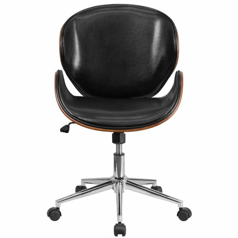 This office chair features a beautiful walnut bentwood frame with glossy black LeatherSoft upholstery. LeatherSoft is leather and polyurethane for added softness and durability. A mid-back office chair offers support to the mid-to-upper back region. The tilt lock mechanism rocks/tilts the chair and locks in an upright position while the tilt tension adjustment knob adjusts the chair’s backward tilt resistance. The contoured backrest provides firm back support. Chair easily swivels 360 degrees to get the maximum use of your workspace without strain. The pneumatic adjustment lever will allow you to easily adjust the seat to your desired height. This chair is sure to make an impression and become the focal point in your office or home office.