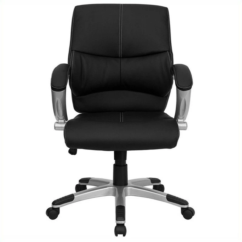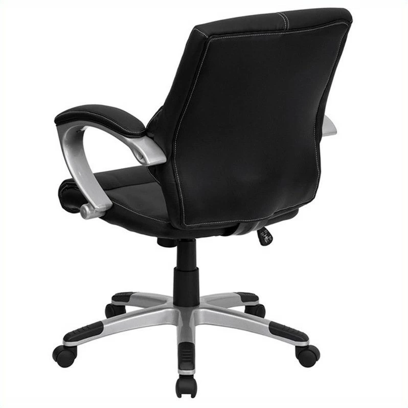 This Black Mid-Back Executive Office Chair features soft leather upholstery with baseball glove stitching. with built-in lumbar support, a well-padded seat and back, and padded loop arms this is sure to bring a stylish addition to your office. Chair features a silver nylon base with black caps that prevent feet from slipping. [H-9637L-2-MID-GG]