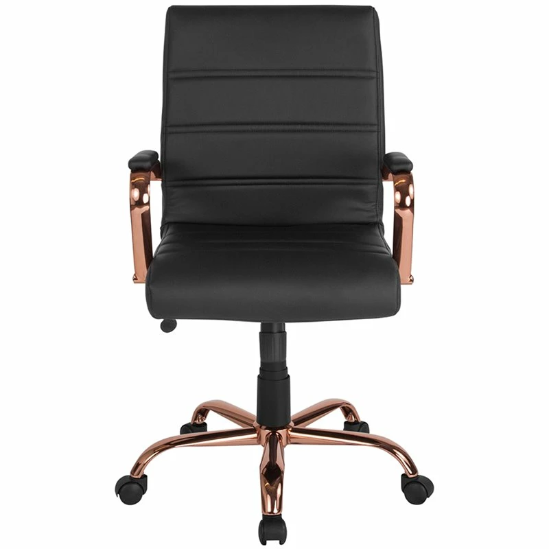 Toss out that old and boring office chair that you’ve had for years, because it’s time for an upgrade with this sleek mid-back leather office chair. No longer used in just offices, you are seeing office chairs used in nail salons, car shops, and stores to help busy workers achieve maximum comfort while performing their work duties. Upholstered in soft and durable LeatherSoft upholstery and paired with gold finishing help construct this modern office chair. Designed with your comfort in mind, this ergonomic desk chair features ample padding to get you through an 8-hour workday or be your seating of choice to furnish your conference room. With its adjustable features you can lean back while you take a quick phone call or lock in an upright position when it’s time to focus. The knob located underneath the seat adjusts the force needed to recline. Improve the look at your desk or work area with this stylish mid-back black LeatherSoft office chair with rose gold metal base that is highlighted by attractive horizontal line stitching. A waterfall front edge seat reduces pressure off your legs while the armrest pads relieve the pressure off your necks and help round out the look and comfort of this chair.
