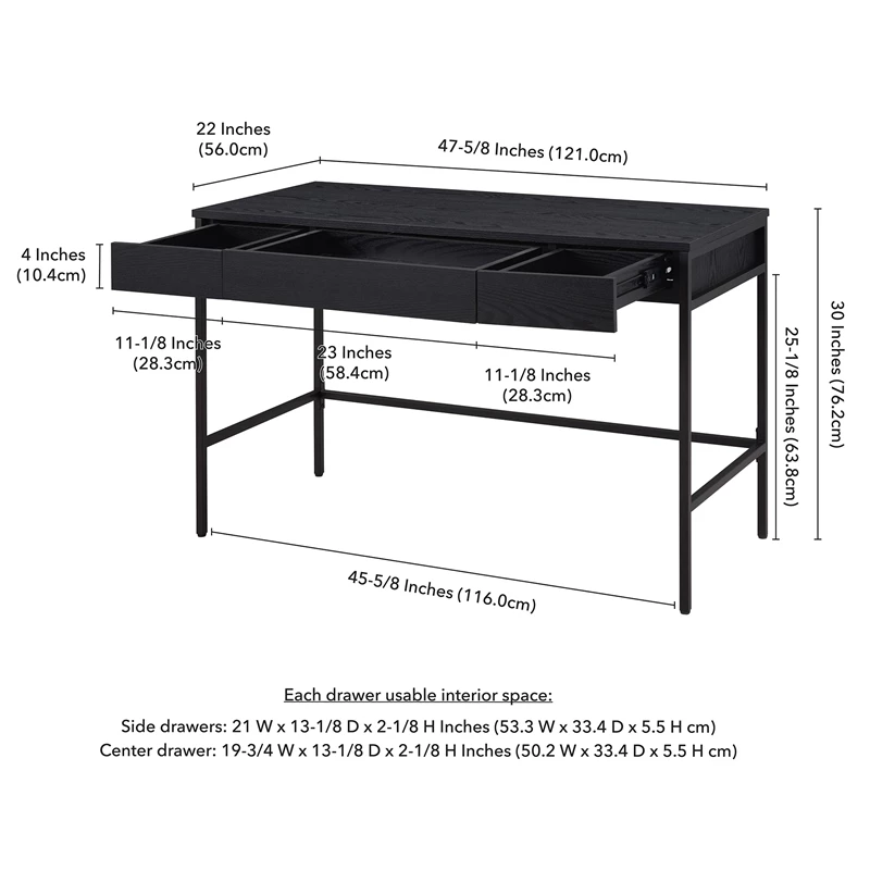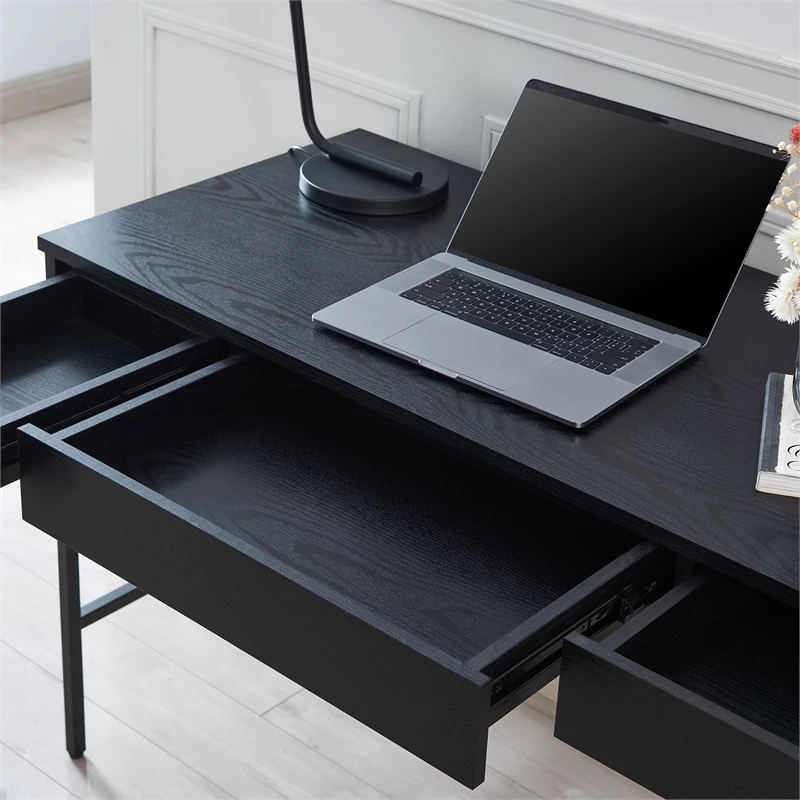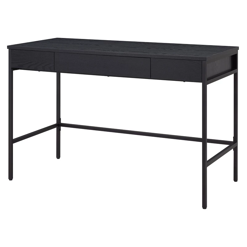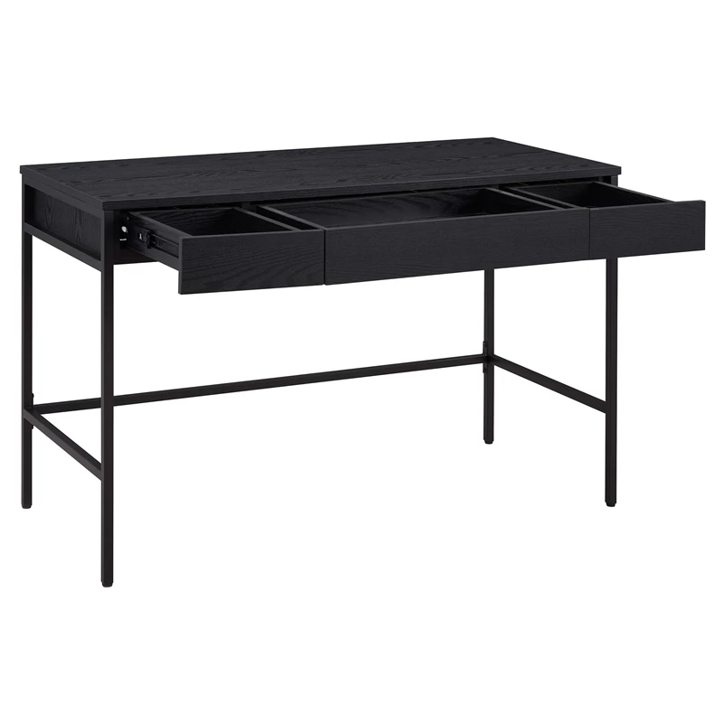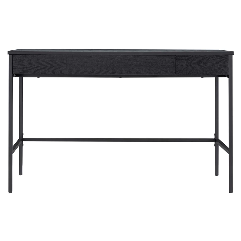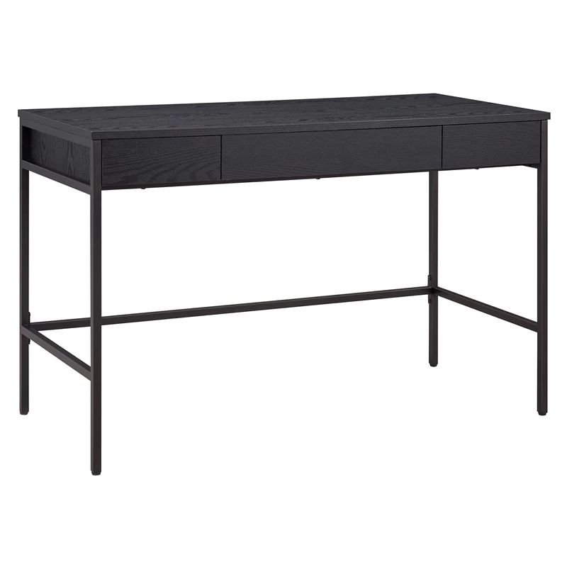 Cultivate mid-century style in your home office, game room, or vanity area with this modern desk. The sleek lines of its black steel base are offset by a sturdy MDF desktop, finshed in a warm rustic tone. This desk features three push-to-open drawers for storage, while the open lower space provides plenty of room to settle in and take on the day. It’s time to work from home in style!