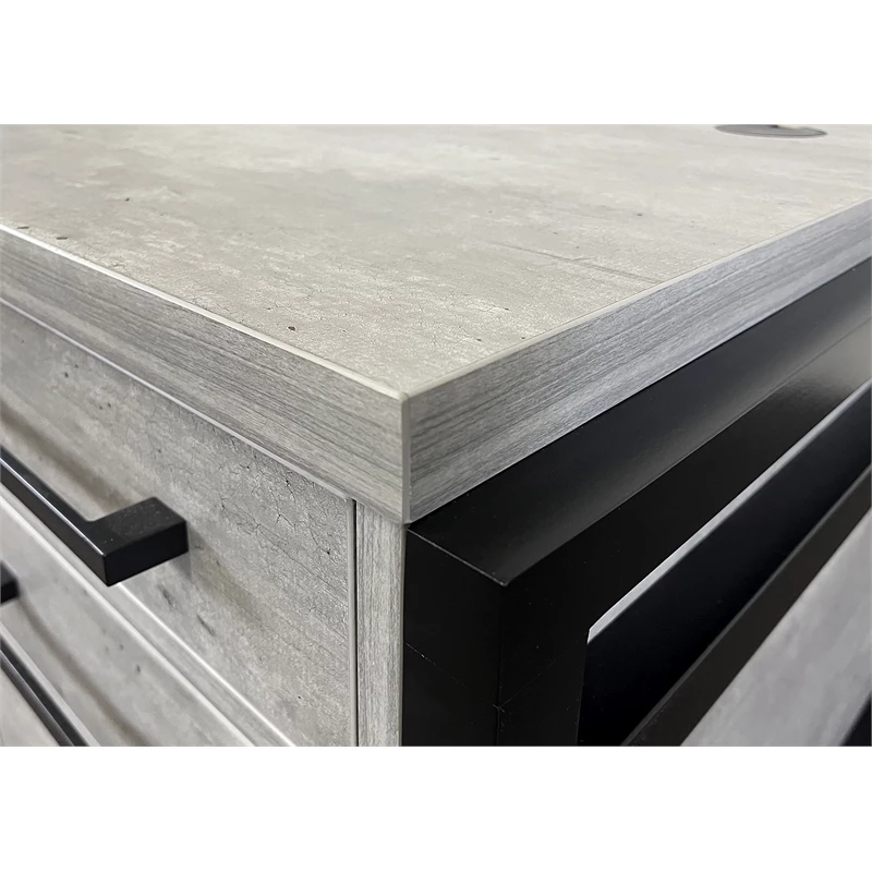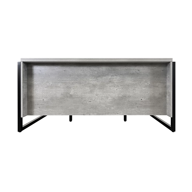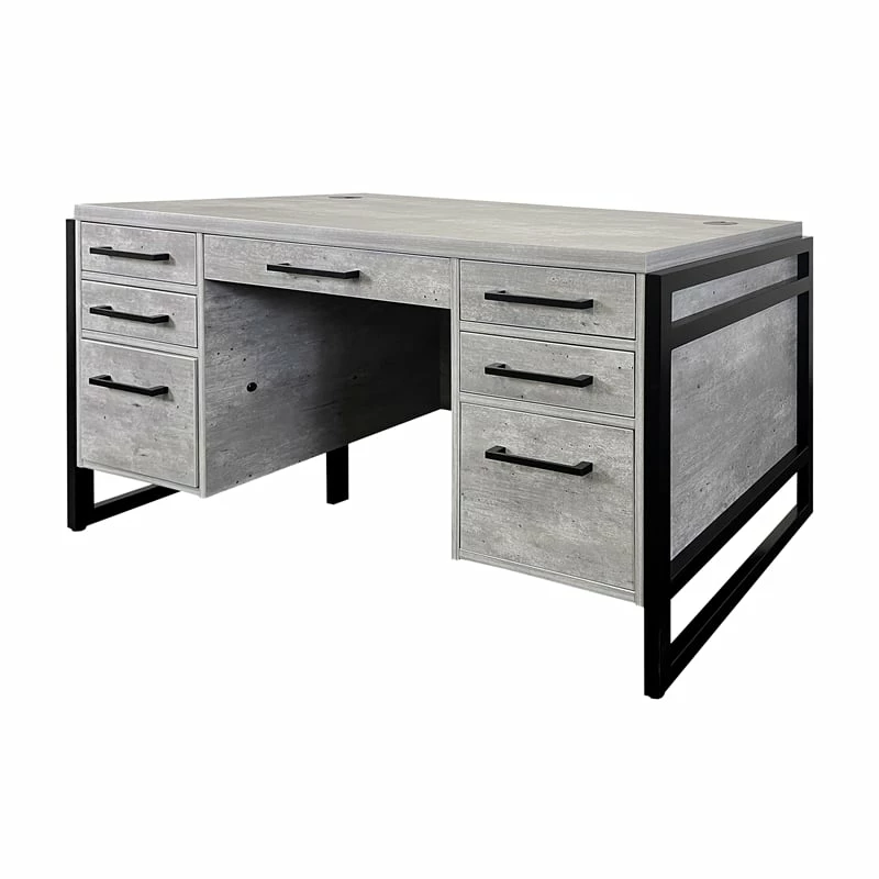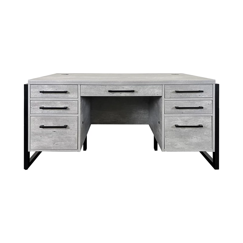 Solid wood framing accents the laminate and lends a modern appeal while contemporary metal hardware completes the look. The Mason collection provides functionality with storage and space saving options and fits perfectly in any home or executive office. The gray wood executive desk has one pencil drawer, two legal/letter file drawers, four utility drawers, two grommets for wire management and is fully assembled.