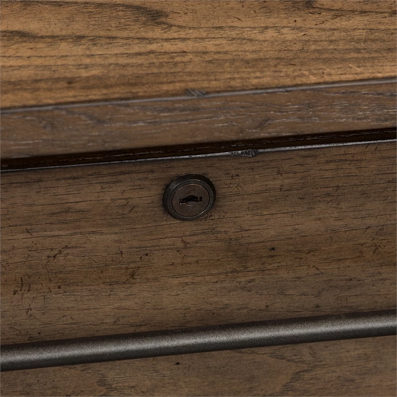 Create a natural feel with the Pemberly Row lateral file. Crafted of poplar solids and cathedral hickory veneers, this piece features a weather-beaten bark finish accented with antique pewter bar pull hardware. There are two full extension lockable file drawers to keep your contents safe. With the bluff-cut drawer fronts, an illusion is given of multiple smaller drawers, while still offering deep storage. Pemberly Row is the essence of Urban Living styling with a weather-beaten bark finish combined with metal accents throughout the collection.