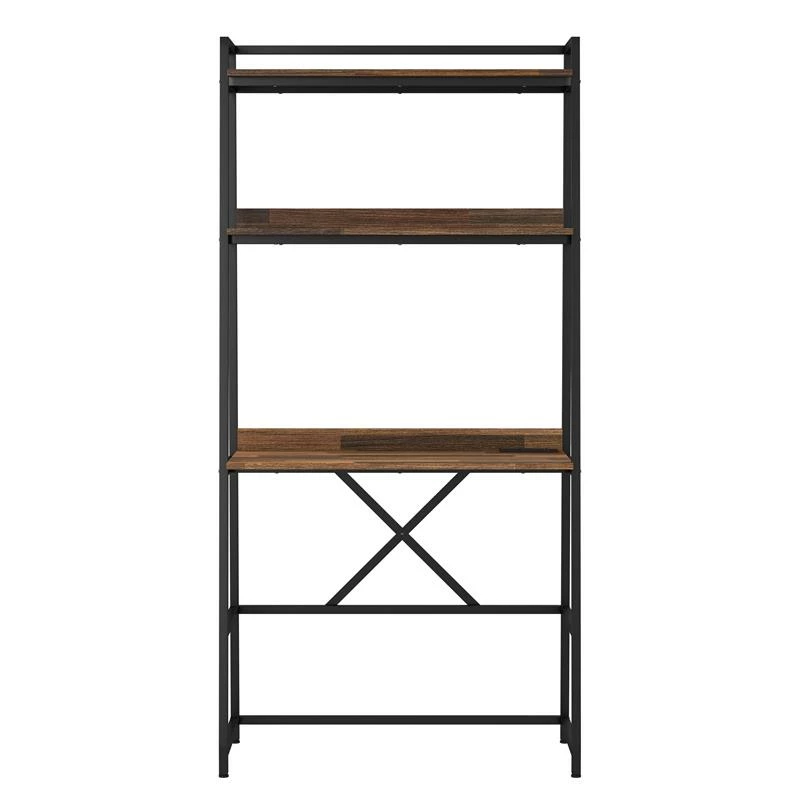 Perfect for that occasional work-from-home day or for easy online browsing from your tablet or laptop, this tall brown and black writing desk is a minimalist design with modern angularity. It’s ideal for a shared family space and offers both power and USB outlets in the desktop for easy access to charge a phone or Bluetooth devices. This tall, wood bookcase desk design features a metal frame in a black finish, complete with angled supports and an X-cross brace for added stability.