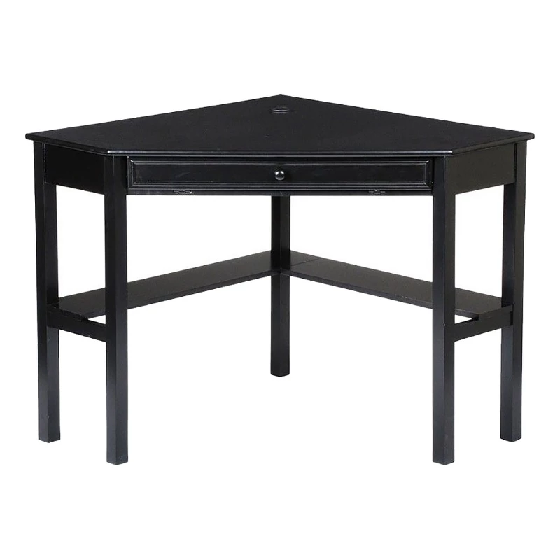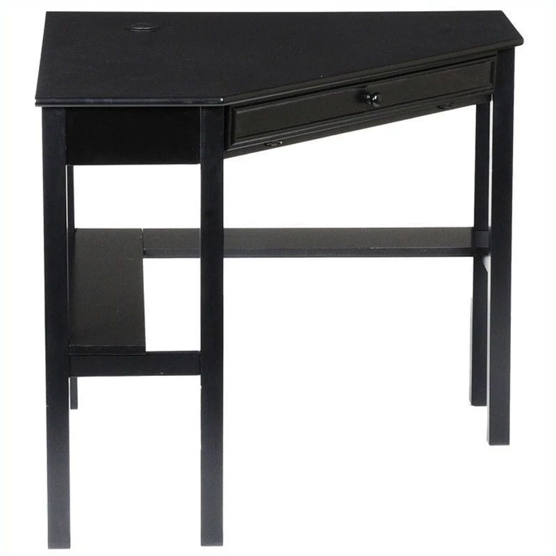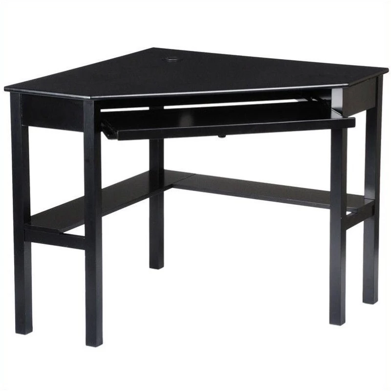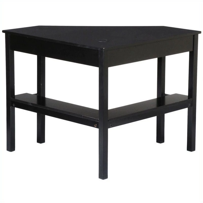 No house is complete in the modern era without a convenient home office. Why settle for a solution that clutters your home when this contemporary black corner desk can save you space and add style? On the top, a circular cord keeper is recessed into the surface near the corner to guide and organize all of your computer cords. The front drawer folds down to reveal a retractable tray that allows you to store your keyboard and mouse dust free and out of sight. Approximately 14″ above the floor, an 8″ deep shelf lines the back edge of the desk along the wall for easily accessible storage of books, disks or other computer gadgets. Both a stylish and useful piece of furniture, this corner computer desk is a must have for every home.