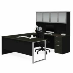 The Pemberly Row U Desk with 4 Door Hutch in a sophisticated Deep Gray and Black finish is a statement of modern efficiency and style. This U-shaped desk offers ample workspace and a hutch with four doors for added storage. The Deep Gray and Black finish combination adds a contemporary edge to your office decor. With this U Desk, you’ll have the space and functionality required for productive workdays, whether you’re working from home or in an office setting.