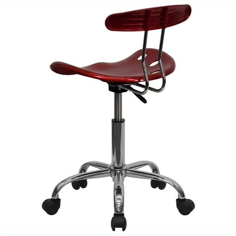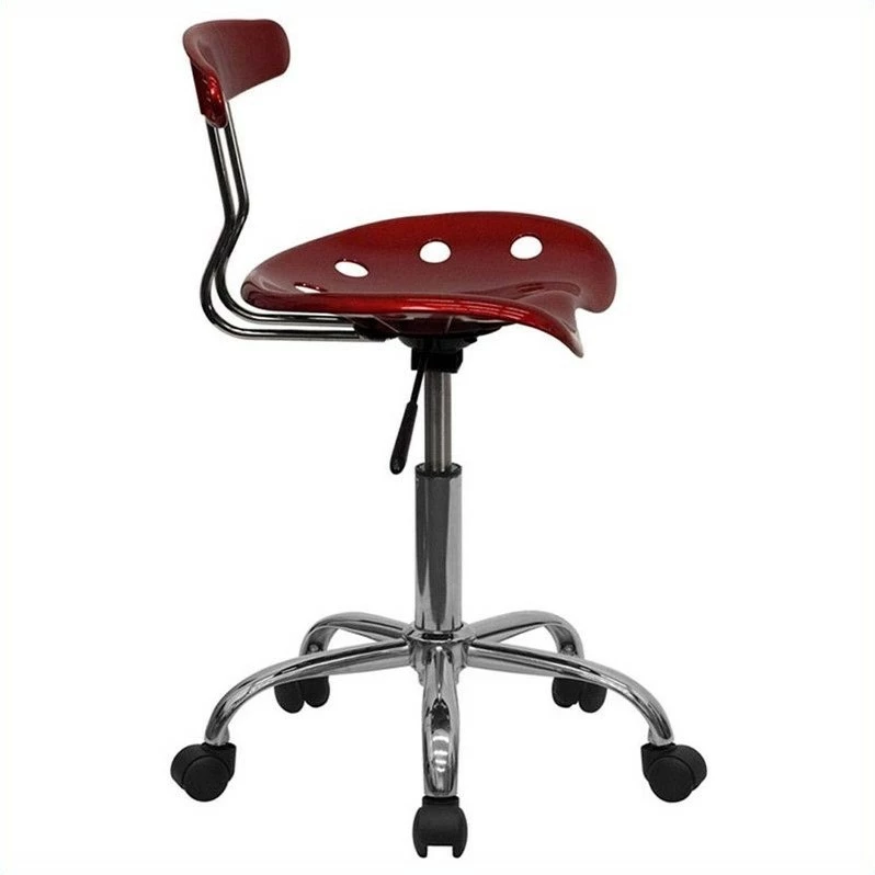Change up the look in your home office with this colorful vibrant wine red task chair. The molded tractor seat offers a tremendous amount of comfort and can be cleaned with a solvent and water based cleaner such as foam. Chair rotates 360 degrees to provide easy access to a greater range of area. The pneumatic adjustment lever will allow you to easily adjust the seat to your desired height. Dual wheel casters provide ease of movement around the space. The small frame of this chair will not take up a lot of space if working in a small area.