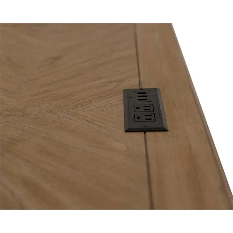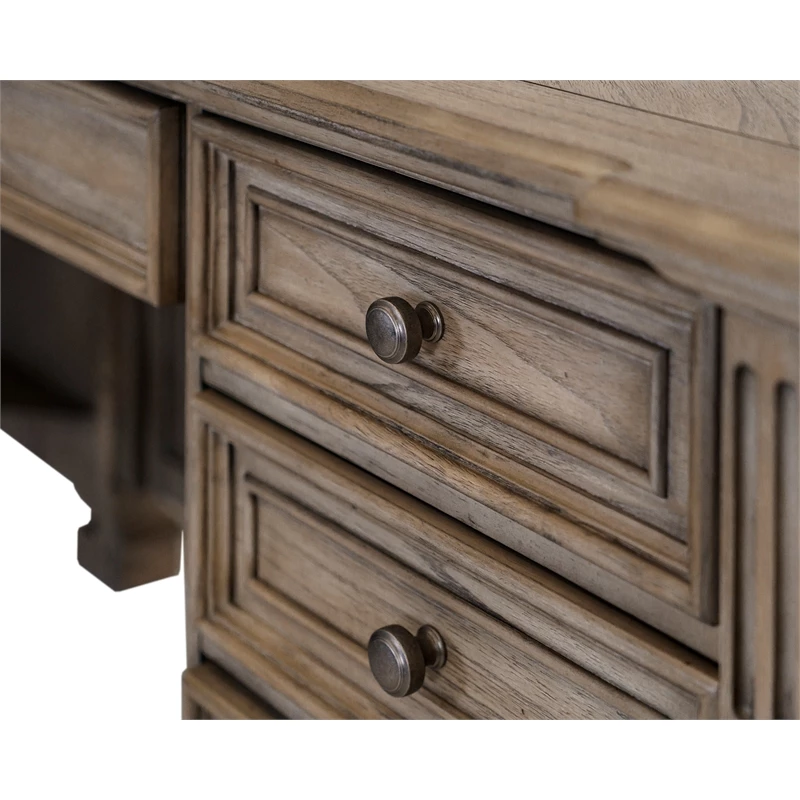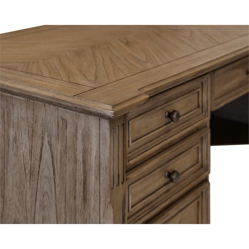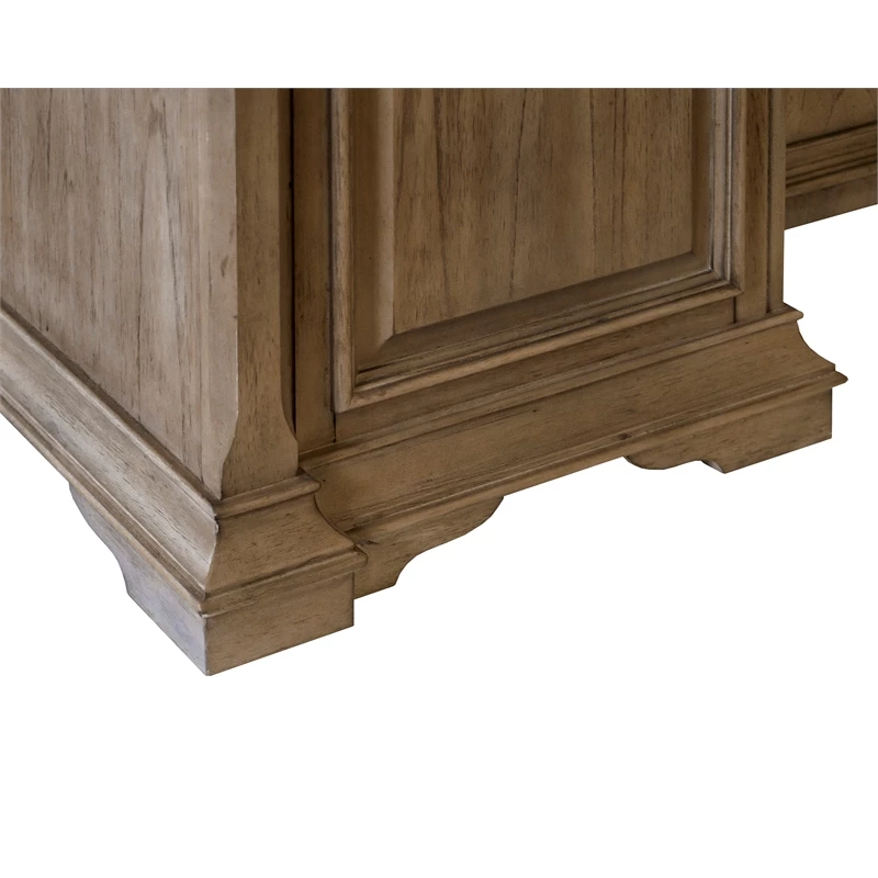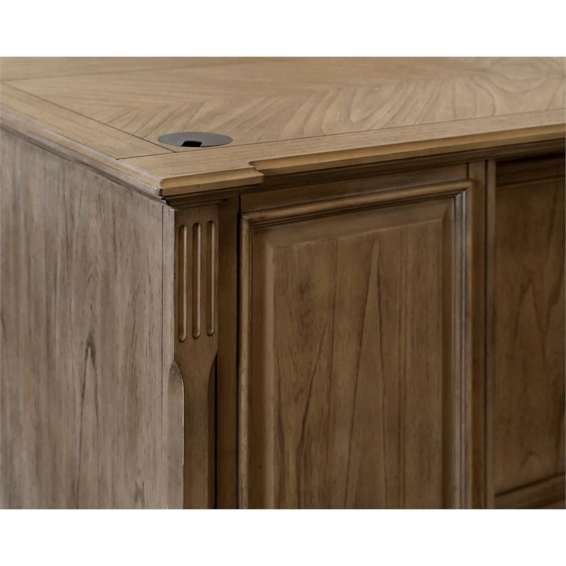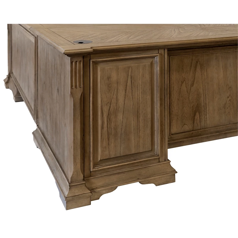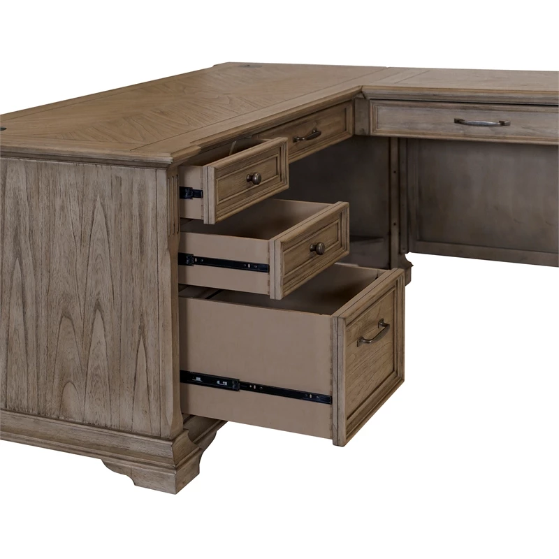 The traditional wood L desk has two keyboard/pencil drawers with ball bearing glides, two locking file drawers, four utility drawers for additional storage, a power center with AC outlets and USB 2.0 ports, is finished on all sides, has mottled antique hardware that enhances the look of the collection and distressed natural light brown finish.