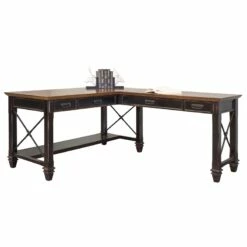 The classic black wood style elements of the writing desk makes it a perfect addition to any home. The writing desk includes a center drawer with a drop down front to hold a keyboard and wire management to control cables. It is fully finished on all sides.