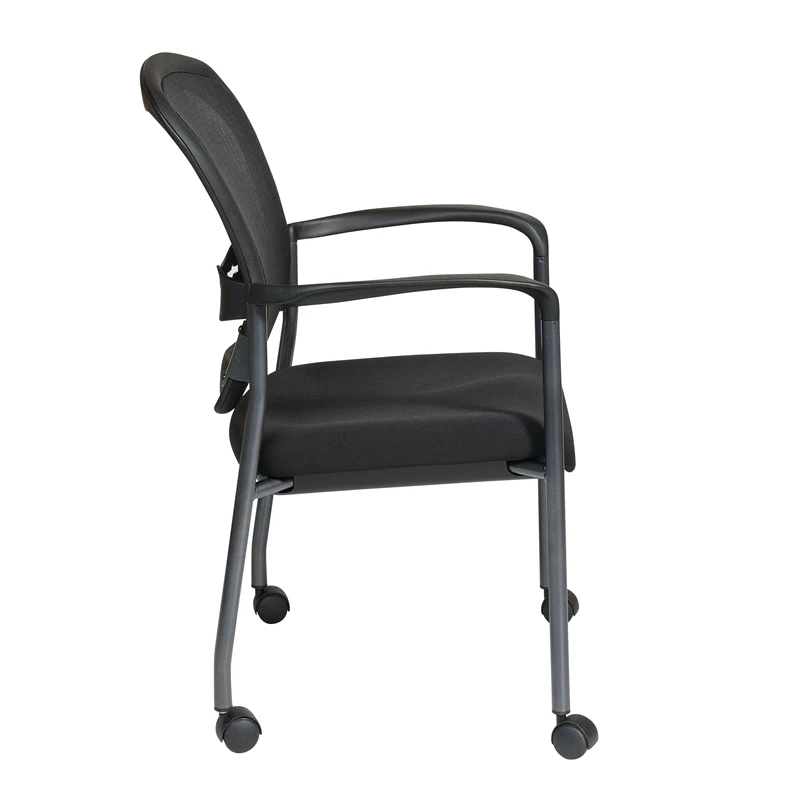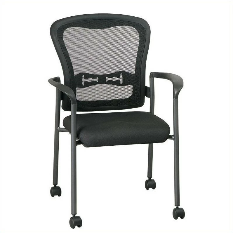 Welcome someone into your business and offer them a seat on one of our comfortable Pro-Line II® Deluxe Stacking chairs. This sturdy Titanium finish chair features a breathable ProGrid® Back with built-in lumbar support and Coal FreeFlex® padded fabric seat and come complete with Nylon armrests and dual wheel carpet casters. Designed to be stackable to save precious office space when not in use, our GreenGuard indoor air quality certified chairs are backed by a limited lifetime warranty, so customers & employees alike will enjoy using your chairs for years to come.