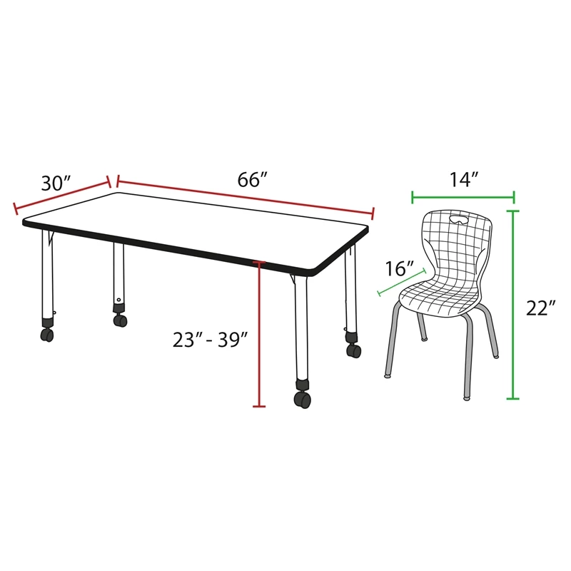 - Mobile Rectangle Classroom Table and Chairs Set includes 66″ x 30″ Table and 2 Navy Blue Andy 12-in Stack Chairs