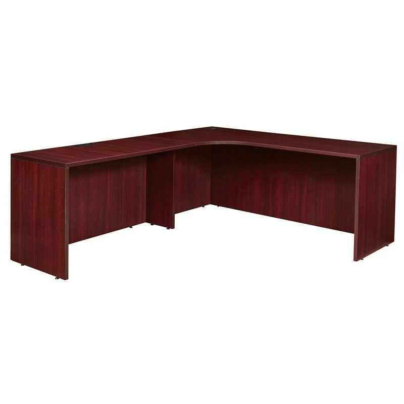 Legacy desk shells are the framework for a complete office. Customize with pedestals, hutches or other storage options. This 71-inch long corner credenza shell is a classic corner workstation and has a curved center for a seamless transition between credenza and return. This desk shell is not reversible and the return must be attached to the left hand side of the desk. Three wire management grommets keep cables clear of work areas. Adjustable glides on the bottom of the base keep the desktop level and are easy to adjust. Finished in a classic Mahogany laminate, this desk shell coordinates with other Legacy furniture. The Legacy collection is constructed of a 1-inch thick thermal fused melamine laminate with a 3-millimeter commercial grade matching PVC edge. Laminates are scratch, stain and scald resistant. Legacy casegoods are backed by a 10-year limited manufacturer’s warranty.