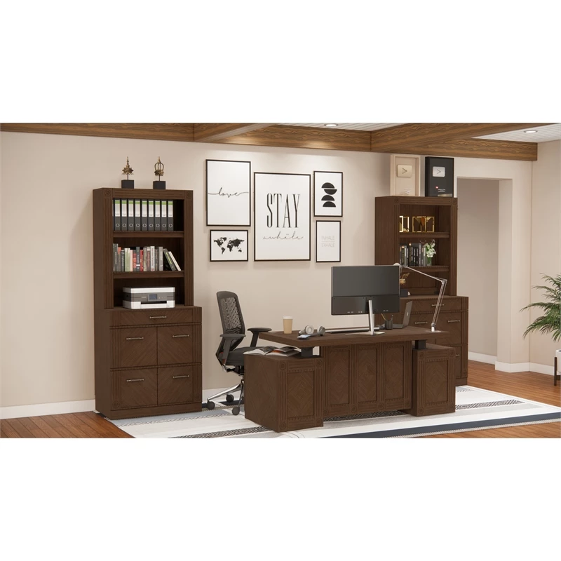 High function for working at home! RoomAndLoft Brown Imperial Sit-Stand Storage Desk & Two File Drawer Bookcases features clean lines with letter/legal file drawers and storage drawers handle it all! Discreet mechanism, multiple charging options, and stylish design make this desk ideal for any office. The two matching file bookcases each have four letter/legal file drawers and a wide box drawer, with adjustable shelving for books and manuals.