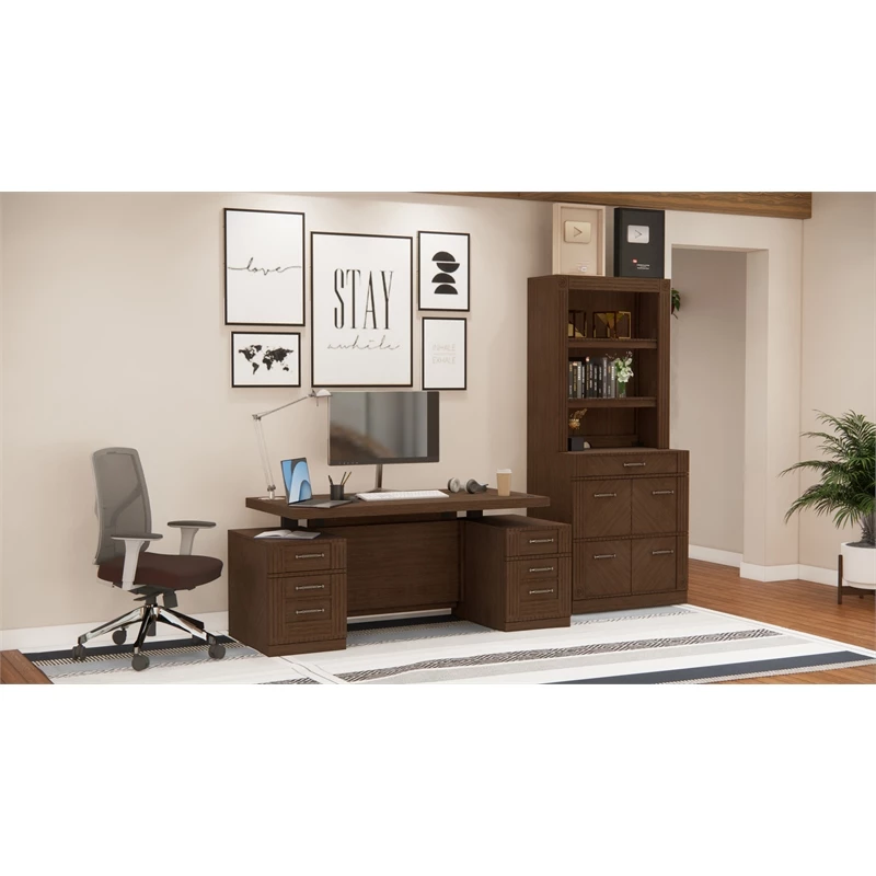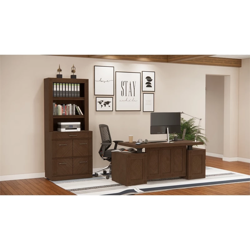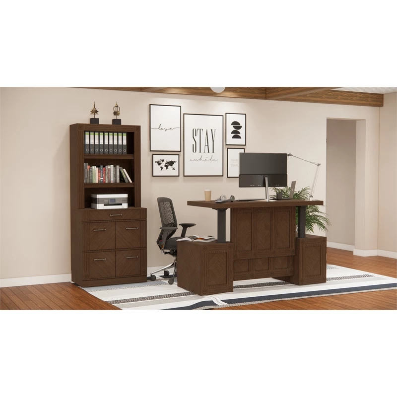 High function for working at home! RoomAndLoft Brown Imperial Sit-Stand Storage Desk with File Drawer Bookcase features clean lines with letter/legal file drawers and storage drawers handle it all! Discreet mechanism, multiple charging options, and stylish design make this desk ideal for any office. The matching file bookcase has four letter/legal file drawers and a wide box drawer, with adjustable shelving for books and manuals.