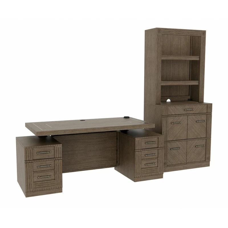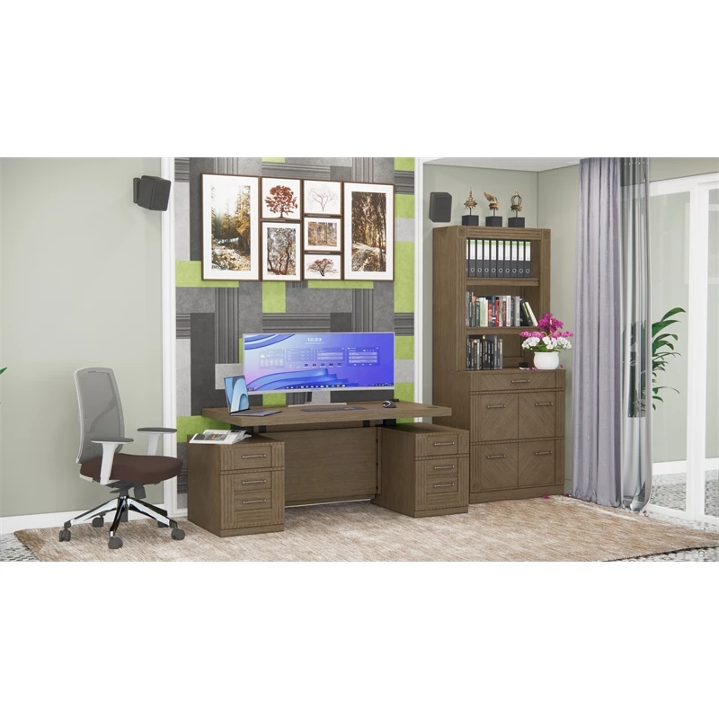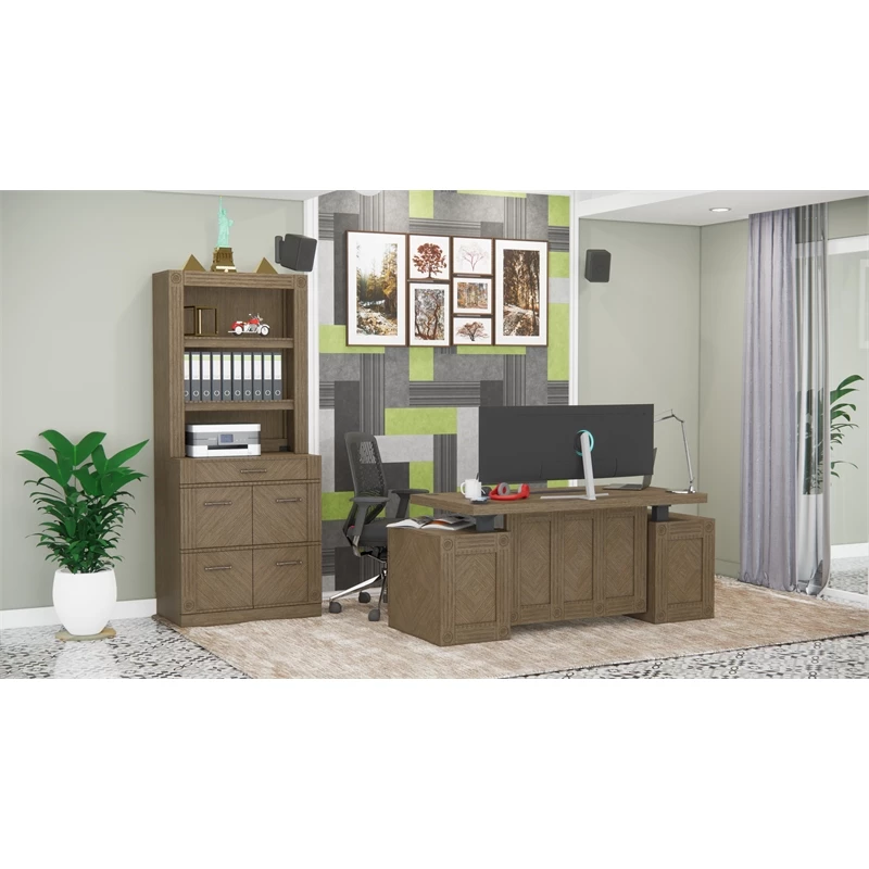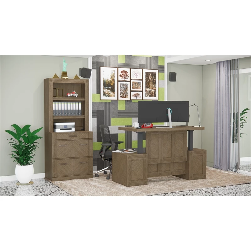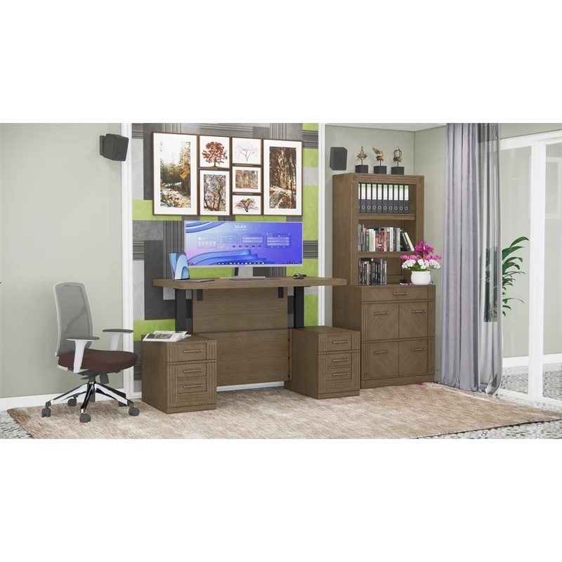 High function for working at home! RoomAndLoft Gray Imperial Sit-Stand Storage Desk with File Drawer Bookcase features clean lines with letter/legal file drawers and storage drawers handle it all! Discreet mechanism, multiple charging options, and stylish design make this desk ideal for any office. The matching file bookcase has four letter/legal file drawers and a wide box drawer, with adjustable shelving for books and manuals.