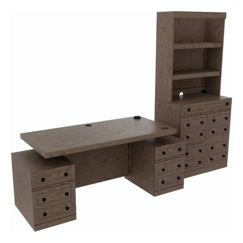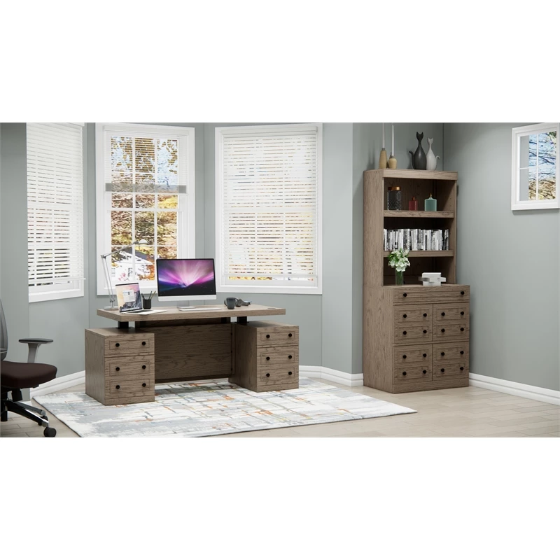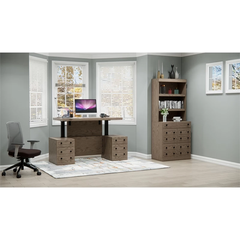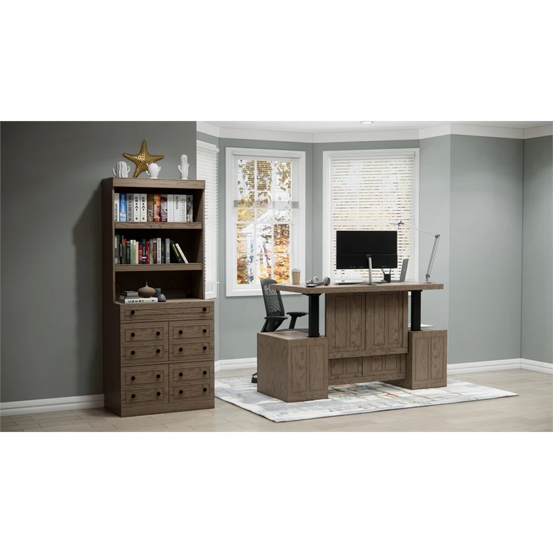 High function for working at home! RoomAndLoft Gray Windsor Sit-Stand Storage Desk with File Drawer Bookcase features clean lines with letter/legal file drawers and storage drawers handle it all! Discreet mechanism, multiple charging options, and stylish design make this desk ideal for any office. The matching file bookcase has four letter/legal file drawers and a wide box drawer, with adjustable shelving for books and manuals.