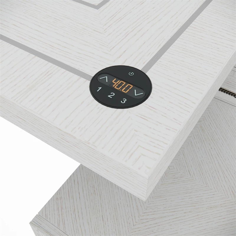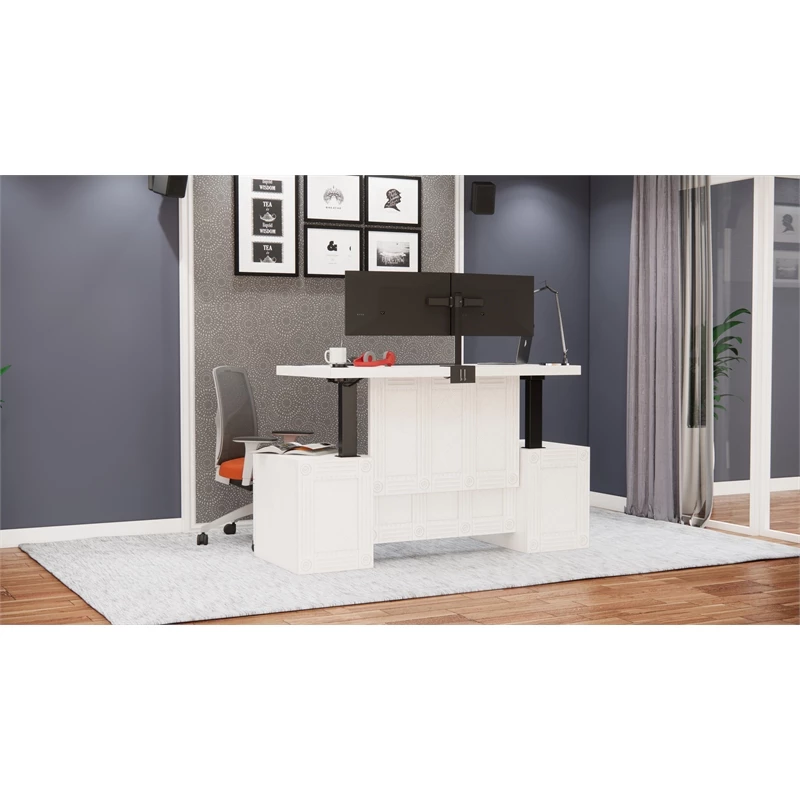 High function for working at home! RoomAndLoft White Imperial Solid Wood Sit-Stand Storage Desk features clean lines with letter/legal file drawers and storage drawers handle it all! Discreet mechanism, multiple charging options, and stylish design make this desk ideal for any office.