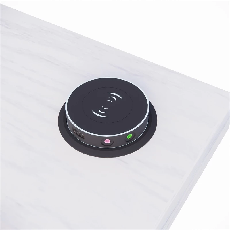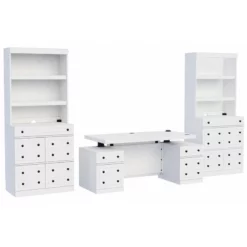 High function for working at home! RoomAndLoft White Windsor Sit-Stand Storage Desk with Two File Drawer Bookcases features clean lines with letter/legal file drawers and storage drawers handle it all! Discreet mechanism, multiple charging options, and stylish design make this desk ideal for any office. The two matching file bookcases each have four letter/legal file drawers and a wide box drawer, with adjustable shelving for books and manuals.