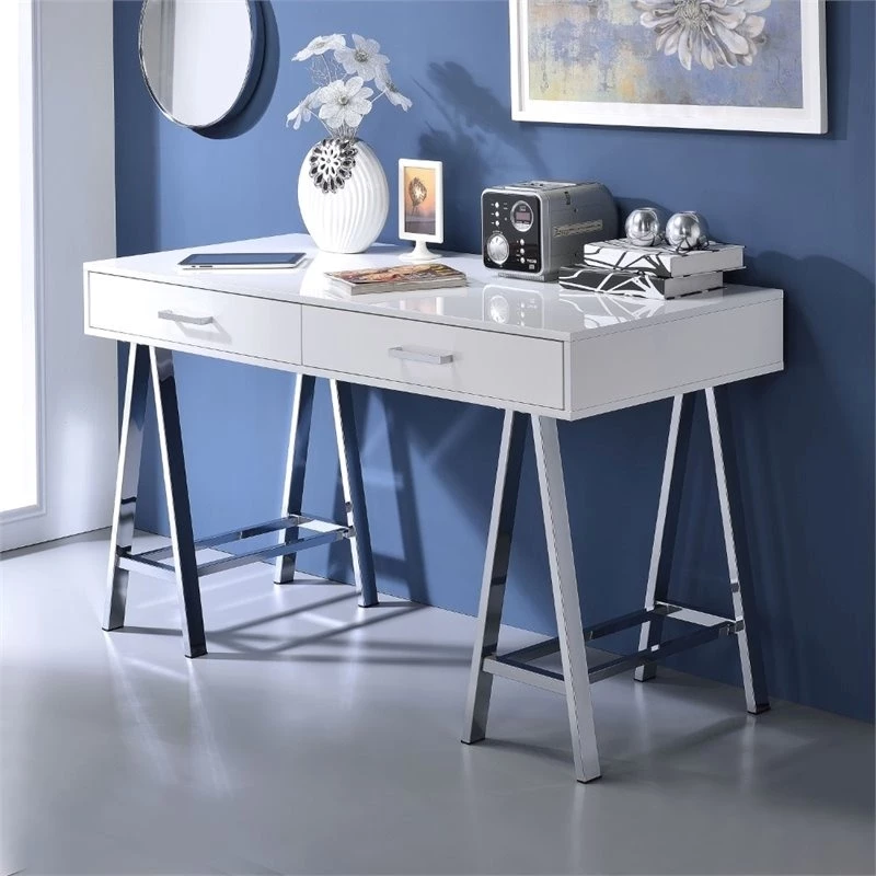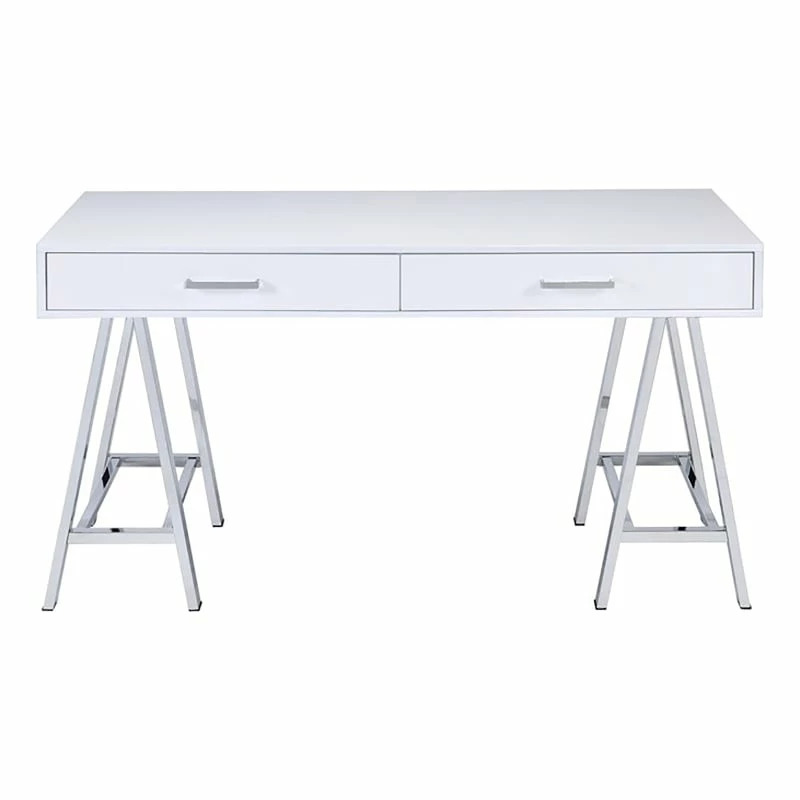 Bring a touch of modern into your home with the Roseberry Kids desk, with its high gloss finished top with 2 drawers. It will serve as the perfect place to hold all of your often used supplies. The base is made up of 2 “sawhorse” designed legs finished in chrome to emphasize this modern task desk. Offered in 3 desk top colors white , red, and black.