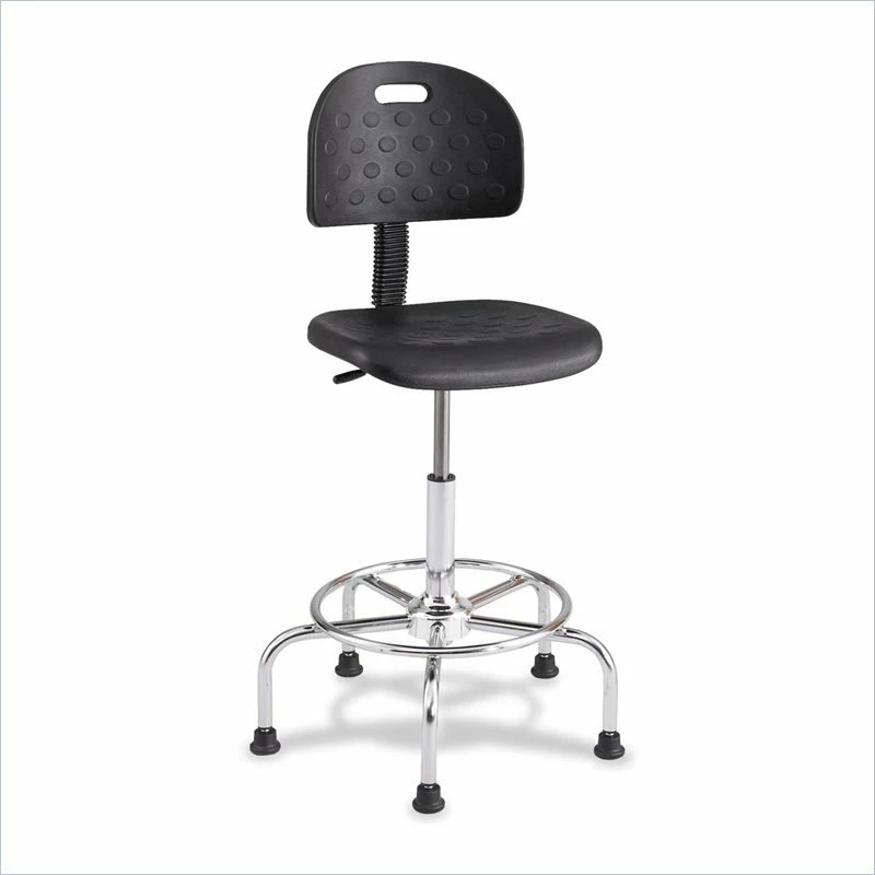 Industrial height stool features a solid molded polyurethane seat and backrest.Welded steel elevated five-spoke tubular base with attached 18″ fixed footrest. High-lift pneumatic seat height adjustment is standard. Simple mechanism manual back depth and height adjustment. Comes with 2-1/2″ glides. Stool measures 24″Dia. x31 to 43-1/2″H overall. Black seat and back with Chrome base.