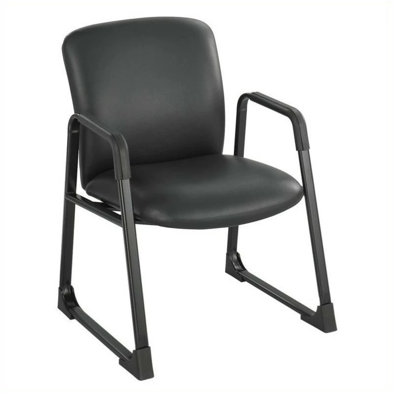 Offer clients of any size the best in wait seating with this oversized office guest chair. The Uber features contour-molded seat and back cushions and full-length integrated arms to make the wait a comfortable one, and its black vinyl upholstery is durable and stain resistant. Reinforced steel sled base with no-scratch glides