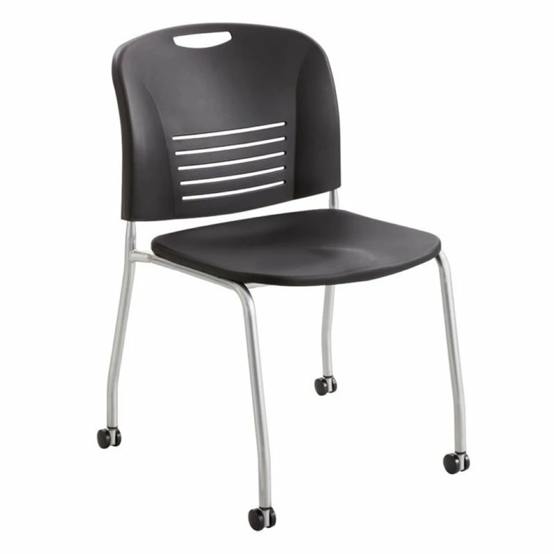 The Vyâ„¢ Straight Leg Chair is a Black, plastic guest chair rated up to 350 lbs. The stackable chair is mobile on a straight leg frame with casters. The guest chair stacks up to 12 high on the floor and up to 18 high on chair cart. Comes packed 2 chairs per carton.