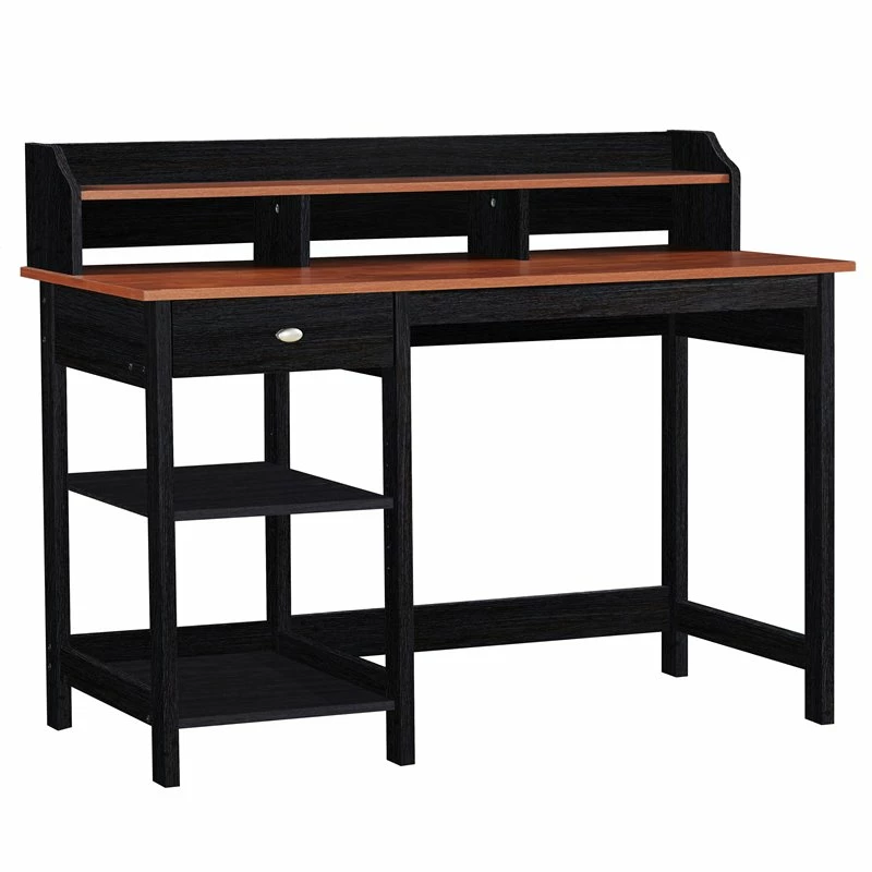 An exceptional farmhouse writing desk and hutch set adds a delightful upgrade to your office space with its eye-catching warm teak and black oak finish. At 47 inches wide for the writing desk, there is plenty of space to organize your workstation essentials and accessories. Its bold farmhouse-inspired color palette and clean design make it ideal for setting the tone and creating a stylish focal point in your home workspace. Find two open shelves and a small drawer on the desk, along with one large open shelf and three divided compartments in the hutch for easy organization.