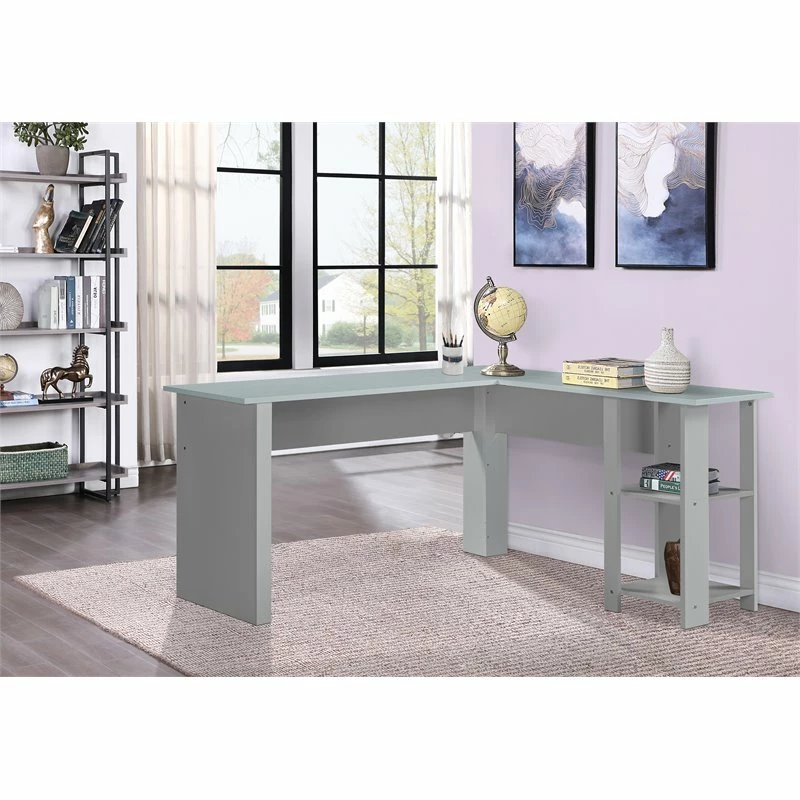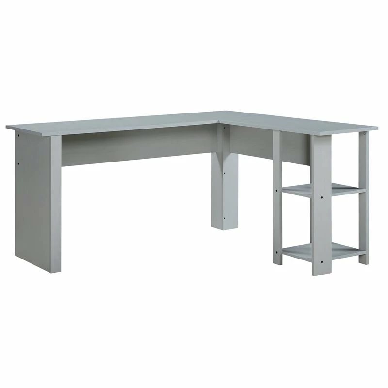 This attractive, L-shaped office desk flaunts a sleek, streamlined silhouette that’s sure to stand out. The expansive, beveled surface allows plenty of space to hold a computer and spread out important paperwork. Two lower storage shelves offer the added convenience of extra storage space. Treated to a rich dark oak finish, this desk is a handsome addition to any modern office.