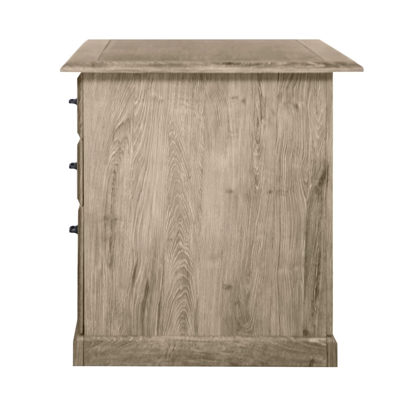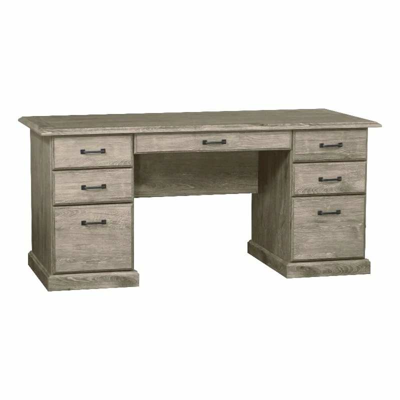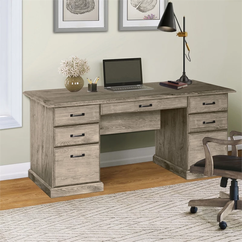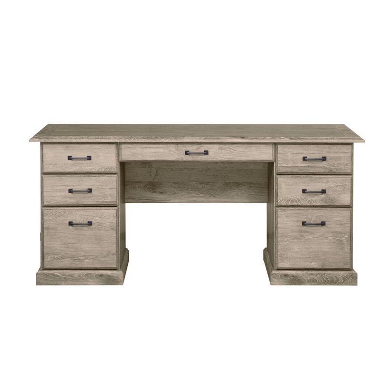 You deserve a home office upgrade and this contemporary seven-drawer executive desk is just the solution. It delivers a charming look complete with a wood grain finish that blends beautifully in a dedicated home office or multi-functional living space. The desk includes two roomy file drawers that work for letter- and legal-sized paperwork to keep everything at your fingertips. Five additional drawers of various sizes are the answer to all your organizational needs, delivering space for notebooks, pens, charging cords and more. A beveled edge decorates the desktop, which is large enough for a dual-monitor set-up or a laptop and accessories to make your work day that much more productive.