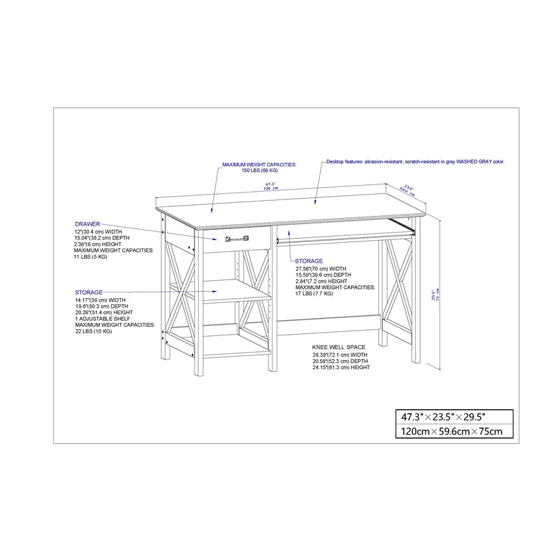 - Desk Dimensions : 47.2″ W x 23.2″ D x 29.5″ H