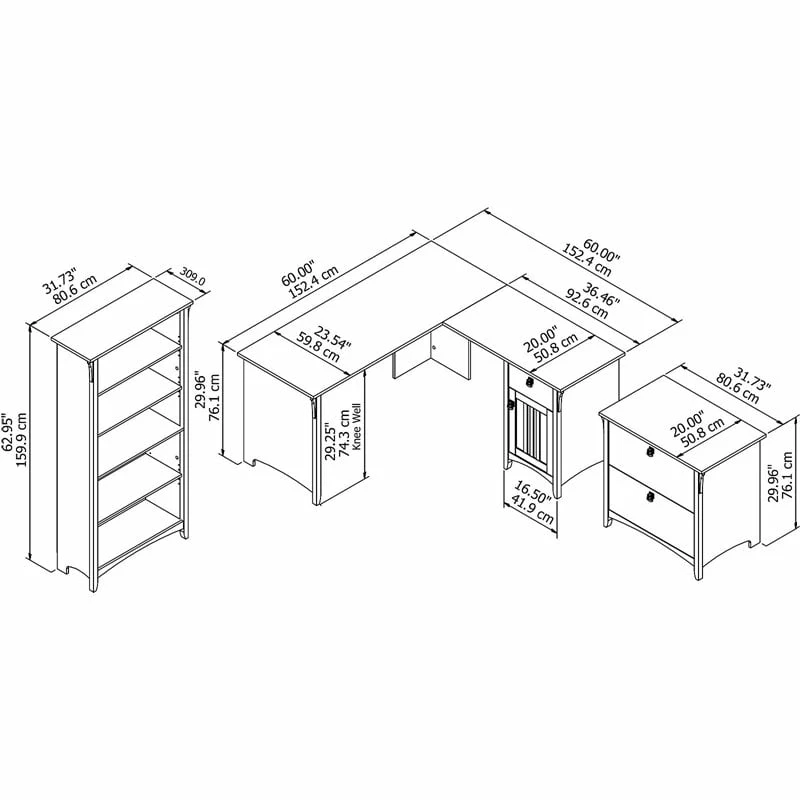 Create a home office space that’s comfortable, functional and beautiful with the Bush Furniture Salinas L Shaped Desk with File Cabinet and 5 Shelf Bookcase. You’ll love all the room you have to multitask on the L Shaped Desk surface, designed to save space in your home with a variety of placement options, including in the corner. A box drawer stores small office supplies while a storage cabinet includes an adjustable shelf for larger items. The Bookcase’s three adjustable shelves make it easy to display books, photos and more while two fixed shelves provide stability. For your legal and letter size documents, the Lateral File Cabinet contains spacious drawers which open on full-extension ball bearing slides. The corner desk with bookshelf and filing cabinet office furniture set is tested to meet ANSI/SOHO quality standards for safety and performance and is backed by a 1 Year Warranty.