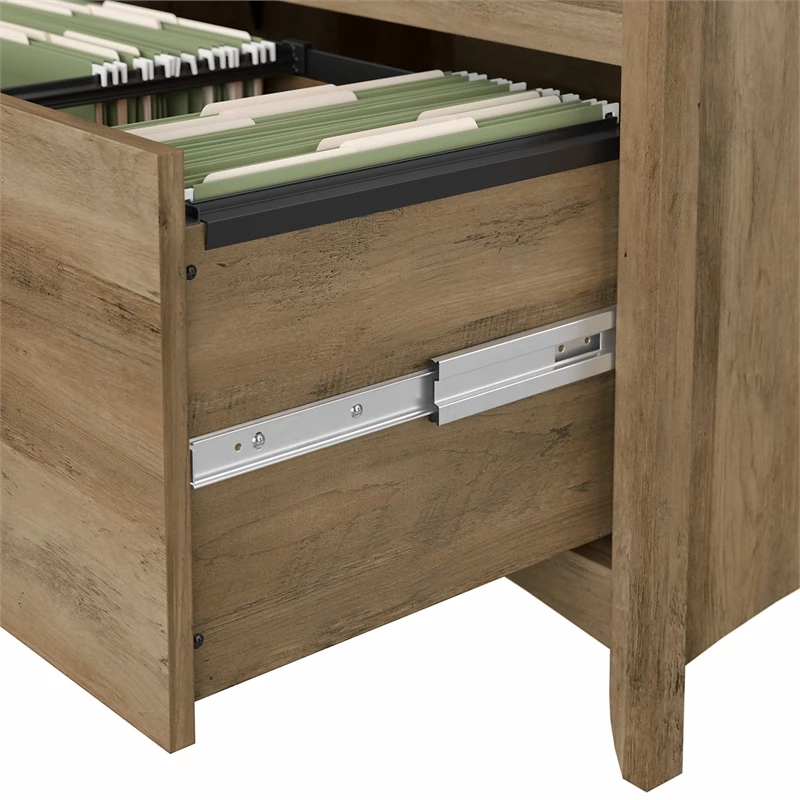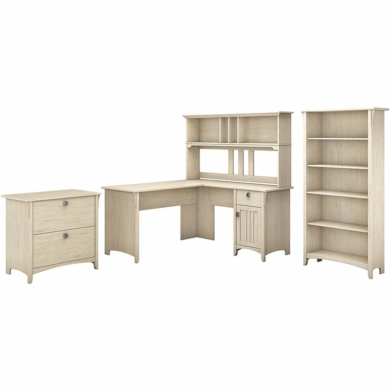 The Bush Furniture Salinas 60W L Shaped Desk with Hutch, Lateral File Cabinet and 5 Shelf Bookcase offers a comprehensive home office solution with casual style. Spread out and multitask on the L Desk’s surface, designed to save space by fitting into a corner. Store writing utensils and supplies in the convenient box drawer and keep larger items in a cabinet with an adjustable shelf. The Hutch attaches to either side of the computer desk and features 2 large cubby areas as well as 2 smaller spaces for storage and display. The 2 drawer filing cabinet opens on full-extension ball bearing slides for an easy reach to legal and letter size documents. A pair of fixed shelves give the Bookcase stability while 3 adjustable shelves accommodate items of various sizes. This corner desk set is tested to meet ANSI/SOHO quality standards for safety and performance and is backed by a 1 Year Warranty.
