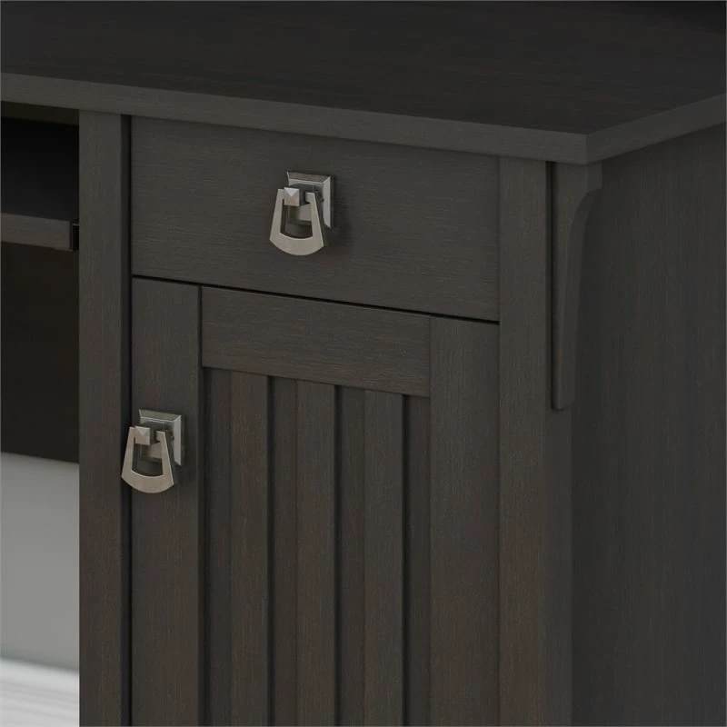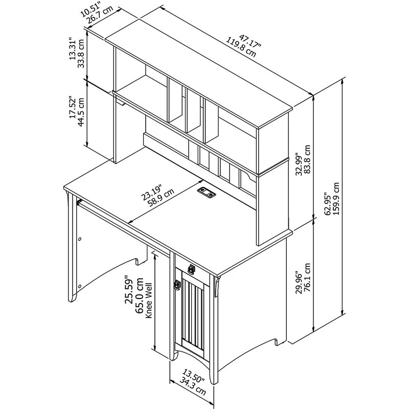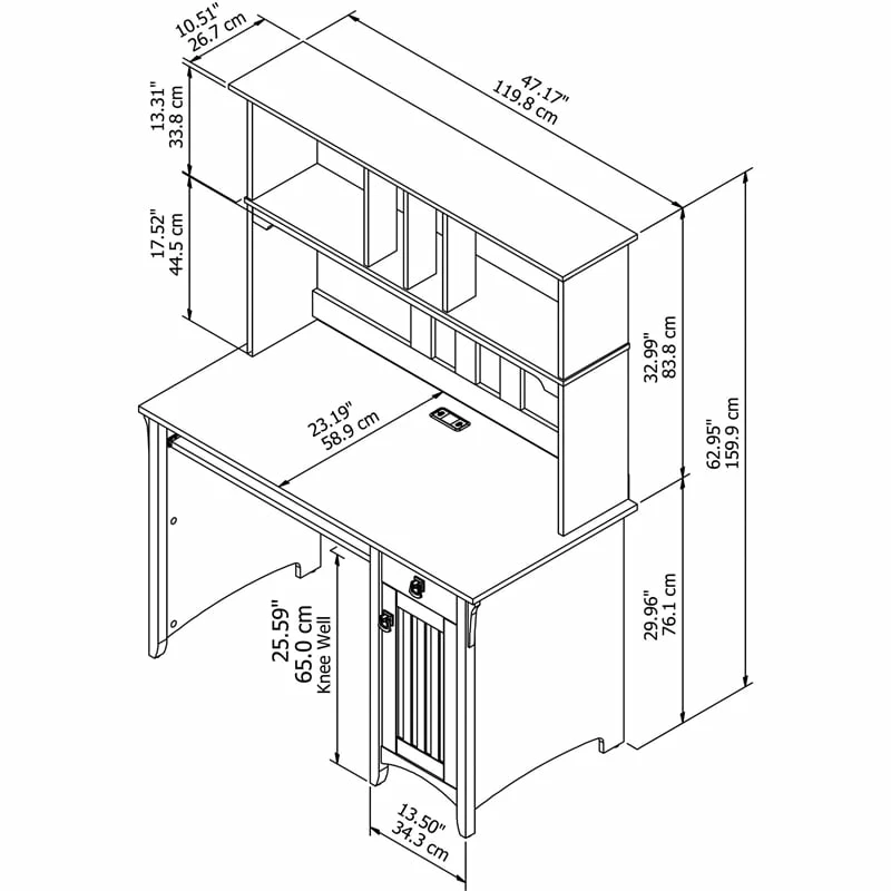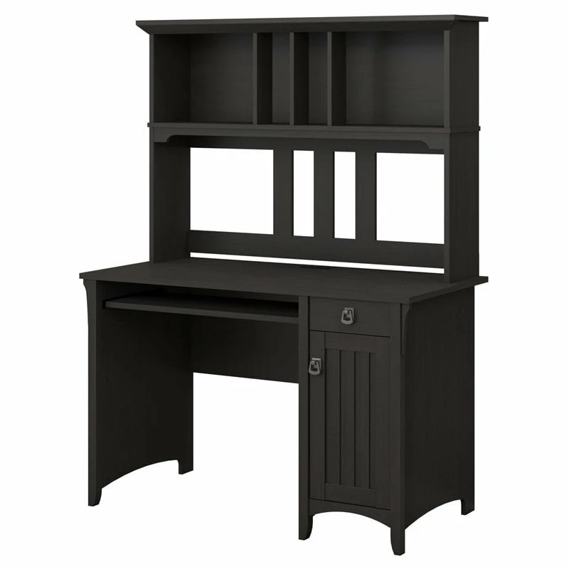 The Bush Furniture Salinas Small Computer Desk with Hutch takes timeless Mission styling and adds plenty of modern touches to help you complete your daily tasks. Technology-ready features include a pullout keyboard tray or laptop shelf and a work surface with built-in wire management to keep cords and cables in order. The Hutch has plenty of storage space for work-in-progress, books, decorations and more while the 48W Desk features a vertical storage cabinet along with a box drawer to organize office supplies and writing utensils. An ideal Computer Desk for small spaces, the compact design boasts a sturdy construction with clean lines, tapered legs and attractive wood detailing. The durable desktop supports up to 200 pounds and offers ample space to complete projects and assignments, pay bills, or surf the web. This home office desk set is backed by a 1 Year Manufacturer’s Warranty.