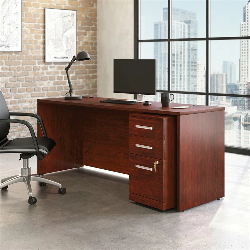 Ultimate configurability without the fuss—The bundled 72″Desk with 3-drawer pedestal file cabinet from the Affirm collection presents durability and function all in one. This 72″ x 24″ commercial desk is constructed with a durable, 1″ thick top surface with resilient melamine protection that is heat, stain, and scratch resistant, ensuring this desk shell is made to last and will endure the rigors of the everyday work day. Your desk will be free of cord clutter with a cord management system with two desk top grommet holes. Adjustable levelers at the base ensure that your commercial office desk will be stable and aligned on the trickiest office terrain. The 3-drawer pedestal file cabinet comes fully assembled, with minimal hardware attachment required, so you can finish your office set-up quickly. Two small drawers with metal runners and safety stops are ideal for storing office essentials, and a locking, lower drawer with full extension slides holds letter or European size hanging files. This mobile file cabinet includes an interlocking safety mechanism that prevents all drawers opening at the same time while using hidden casters for easy movement around the office. Finished in a Classic Cherry®, this commercial 3-drawer pedestal file cabinet with desk complements and completes any office space.