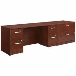 A bundle set with the plenty of hanging file storage. The 72″ x 24″Desk with a lateral file cabinet and two 2-drawer pedestal file cabinets from the Affirm collection is the ultimate desk setup. This commercial desk and lateral file cabinet are constructed with durable, 1″ thick tops, and resilient melamine top surfaces that are heat, stain, and scratch resistant. The 72″Desk includes a cord management system with two desk top grommet holes. Adjustable levelers ensure that your commercial office desk and lateral file will be level, stable, and aligned. The 2-drawer lateral file cabinet and both 2-drawer pedestal file cabinets come fully assembled, with minimal hardware attachment required. The two drawers of the lateral file and both drawers of the mobile file peds are equipped with full extension slides. The larger cabinet holds letter, legal, and European size hanging files while the smaller ped drawers hold letter or European files. This commercial office storage includes an interlocking safety mechanism that allows only one drawer to open at a time. A key lock on the filing drawers ensures safety of your documents. Commercial filing cabinets that are finished on all sides, like these, allow for versatile placement and a polished look from every angle. Finished in a Classic Cherry®, this commercial office desk with storage brings a warm tone with serious looks to any office.