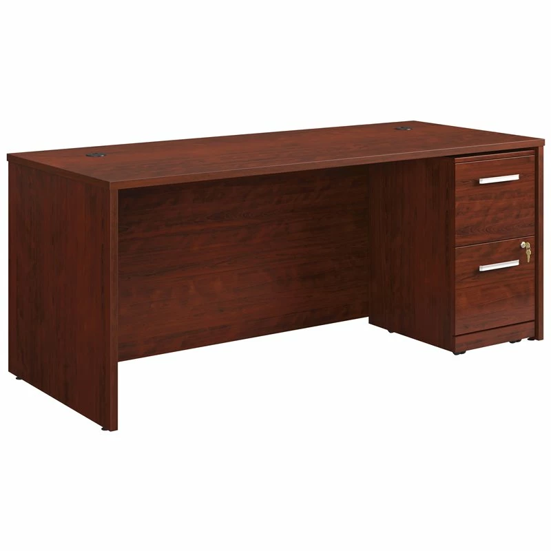 Bring home the bacon with the 72″Desk with 2-drawer pedestal file cabinet bundle from the Affirm™ collection. This 72″ x 30″ commercial desk is constructed with a durable, 1″ thick top, and a resilient melamine top protection that is heat, stain, and scratch resistant with impact resistant, high-grade thermoplastic edges. Your desk will be free of cord clutter with a cord management system with two desk top grommet holes. Adjustable levelers ensure that your commercial office desk will be level, stable, and aligned on the trickiest office terrain. The 2-drawer pedestal file cabinet comes fully assembled, with minimal hardware attachment required, so you can be organized in no time. Two locking file drawers with full extension slides hold letter or European size hanging files. This mobile file cabinet includes an interlocking safety mechanism that prevents both drawers opening at the same time while using hidden casters for easy movement around the office. Finished in a Classic Cherry®, this commercial office desk with storage bundle proves great things come in small packages.