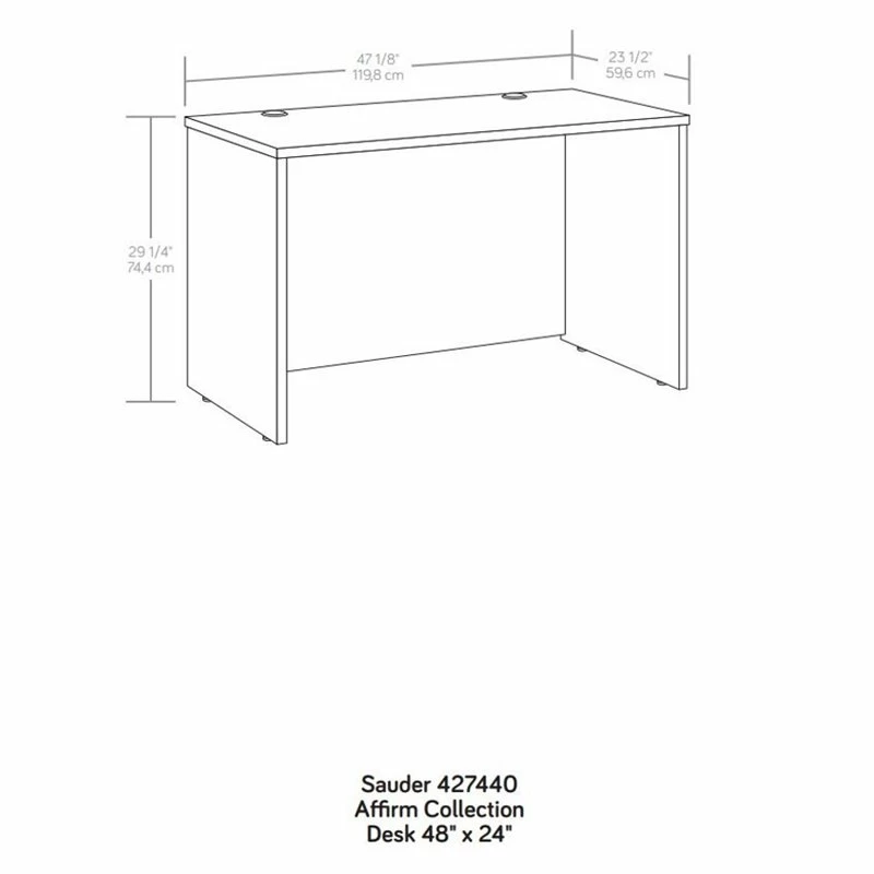 This 48″ x 24″ commercial desk return from the Affirm® collection can be used as a stand-alone solution or can be fastened to the left or right side of other Affirm® items: 427442 Desk 72″ x 24″, 427444 Desk 72″ x 30″, 427441 Desk 60″ x 24″, 427443 Desk 60″ x 30″, 427471 Bowfront Executive Desk 72″ x 36″, or 427445 Bowfront Executive Desk 60″. This 48-inch desk is designed with a durable, 1″ thick top to allow extra space for your desk essentials like your coffee, computer, and stress ball. The melamine top is designed for longevity with a heat, stain, and scratch-resistant surface, making it the ideal option for business desks. An executive desk with added side desk provides extra workspace to enhance any office configuration for ultimate productive output. This melamine office desk includes a cord management system with a two desk top grommet holes to keep your electronic cords organized and out of the way. Adjustable base levelers are included on this commercial office desk to ensure optimal office ergonomics and alignment with other products, especially over uneven flooring. Finished in Noble Elm™, this computer desk will complete your office cubicle or anywhere you need extra desktop space.