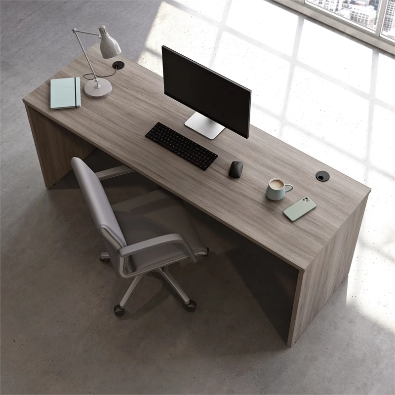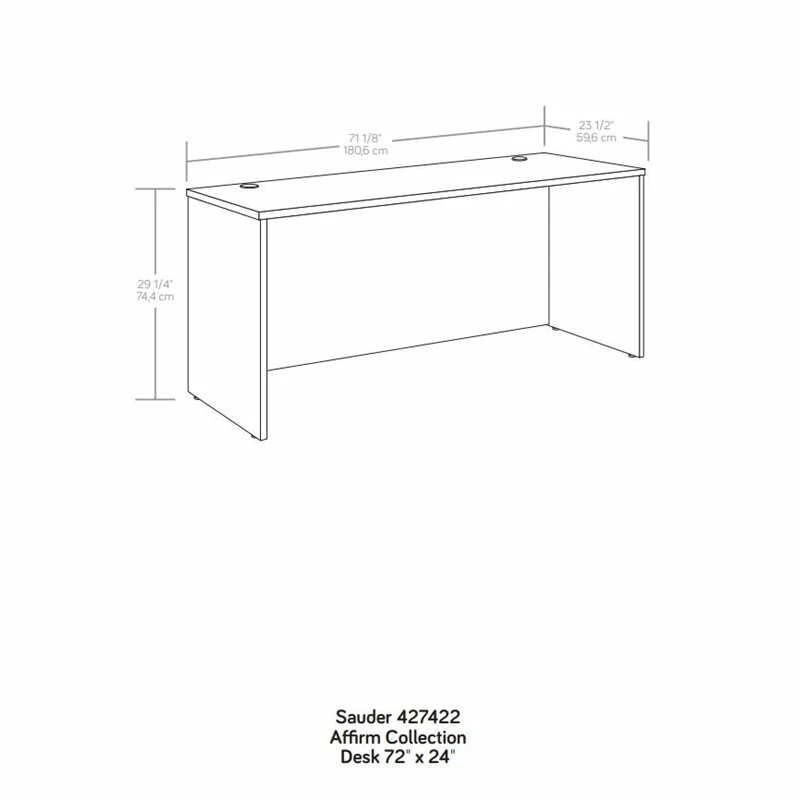 This 72″ x 24″ desk from the Affirm® collection is the ultimate commercial office desk. This commercial desk is constructed with a durable, 1″ thick top surface large enough to hold your file organizer, to-do list, meeting notes, and more. The resilient melamine top surface is heat, stain, and scratch resistant, ensuring this desk shell is made to last and will endure the rigors of the everyday workday. This 72″ desk can be fastened to the left or right side of 427413 Desk Return 42″, 427427 Desk 72″ x 30″, or 427468 Bowfront Executive Desk 72″ x 36″ to create an executive L-shaped configuration and a completed look. The best business desks are free of cord clutter, that’s why this commercial desk includes a cord management system with two desk top grommet holes to prevent unsightly cords. Adjustable levelers ensure that your commercial office desk will be level, stable, and aligned on the trickiest office terrain and uneven floors. Finished in Hudson Elm™, this commercial office desk shell is the ideal addition to any professional office space.