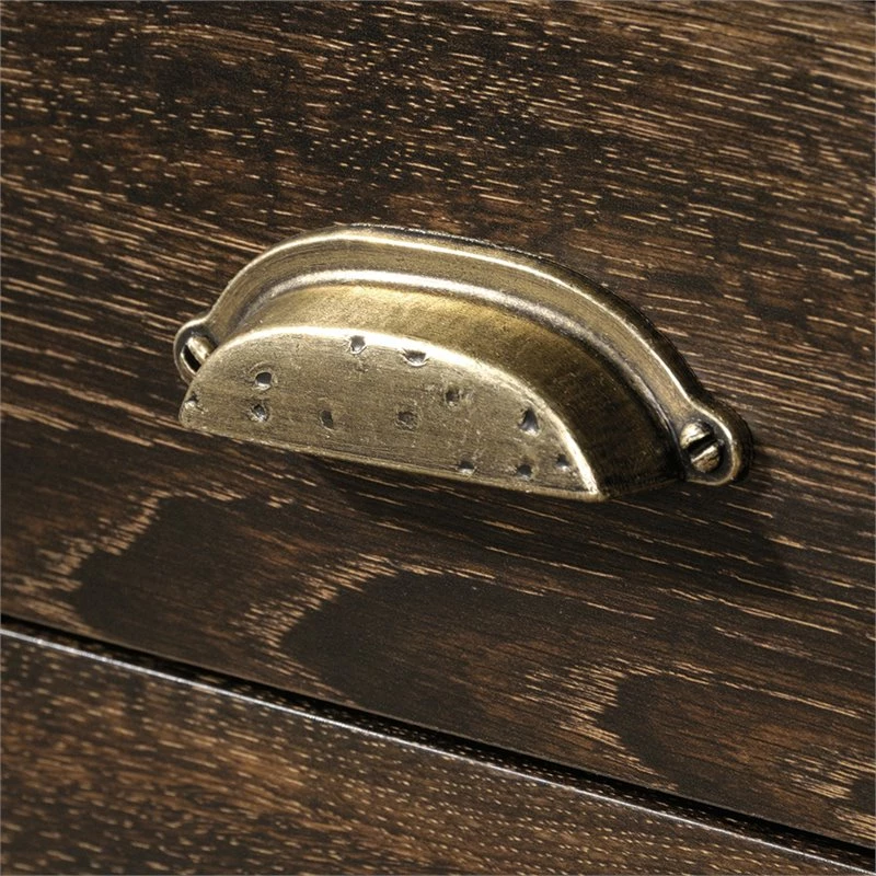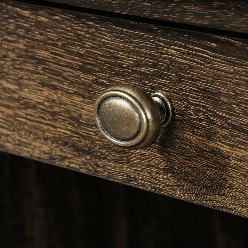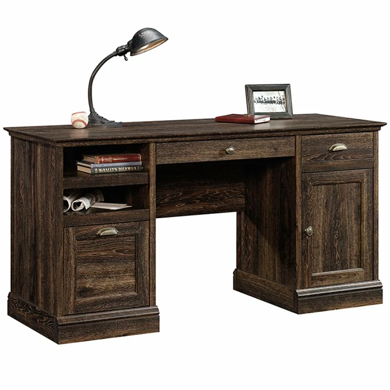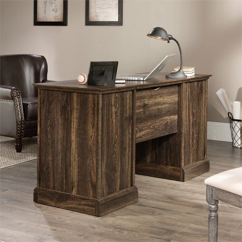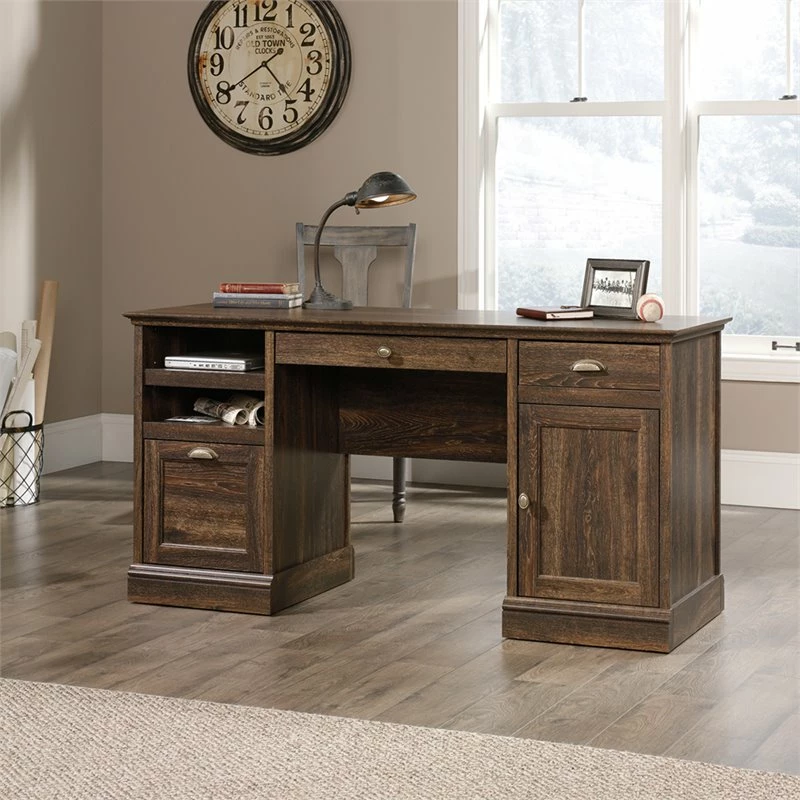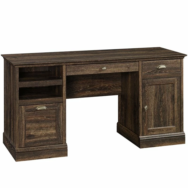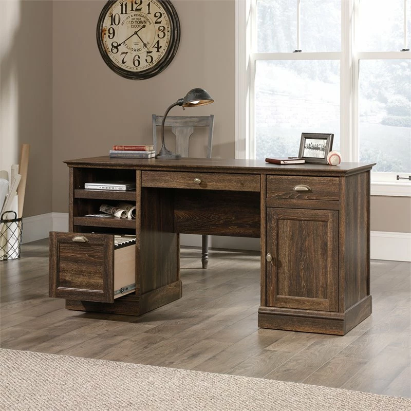 Time to get down to business with this executive desk from the Barrister Lane collection. Its spacious tabletop surface provides you with room for all your must have office essentials – laptop, notebooks, decor, and of course your favorite coffee mug. This handsome desk features two storage drawers that open and close on smooth metal runners. It also includes a lower file drawer with full extension slides to accommodate letter-size hanging files so you can keep organized and clutter free! Behind the door is a hidden storage area that includes an adjustable shelf for all your additional storage needs. It also features open cubbyhole storage with an adjustable shelf for all your easy access office items. Finished on all sides in a stunning Iron Oak and accented with gold hardware, this good looking desk will have you motivated and feeling like a top executive.