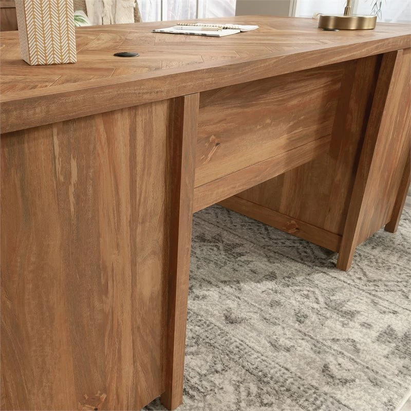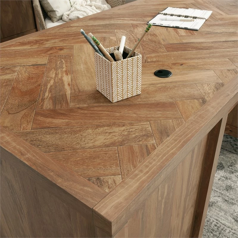 Give your home office or workspace a promotion of a lifetime with this executive desk from the Cannery Bridge® collection. This home office desk with drawers features a spacious top surface with herringbone pattern that provides you with ample amount of room for all your office essentials – laptop, collection of notepads, a cup full of pens and of course your favorite coffee mug. This executive desk with storage features six drawers with full extension slides to accommodate your extra pencils, stapler, folders, and more. These drawers create a convenient space to stow away all your miscellaneous office items. The two lower drawers accommodate letter or legal-size hanging files so you can keep all your important documents and files organized. This executive computer desk also features a cord management system with desk top grommet holes so you can keep all your wires neat and out of sight. This home office furniture is finished on all sides so it will look polished from every angle. Finished in Sindoori Mango®, this beautiful executive desk gives your office space the modern vibe you’ve always wanted.