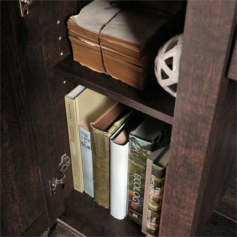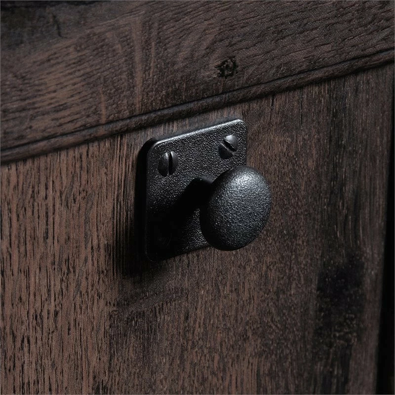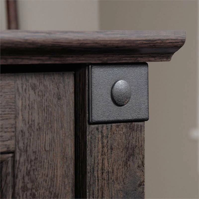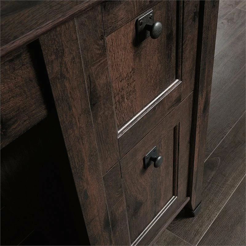 Upgrade your office with this computer desk from the Carson Forge® collection. This home office desks spacious tabletop provides you with room for all your office essentials – sticky notes, folders, a laptop, and more! This wood office desk includes two drawers with metal runners and safety stops—ideal for storing pens, extra paper, and your planner. This computer desk with storage also includes a lower drawer with full extension slides that holds letter or legal size hanging files. A storage area behind the door features an adjustable shelf for customizable storage as well as a dedicated space for a vertical CPU tower. Quick and easy assembly with a patented T-lock drawer system means your new home office desk will be ready to work in no time. A cord management system with a desk top grommet keeps your workspace tidy and clutter free. Finished on all sides in Washington Cherry and paired with wrought iron style hardware and accents, this desk will give your home that rustic aesthetic you’ve been craving.