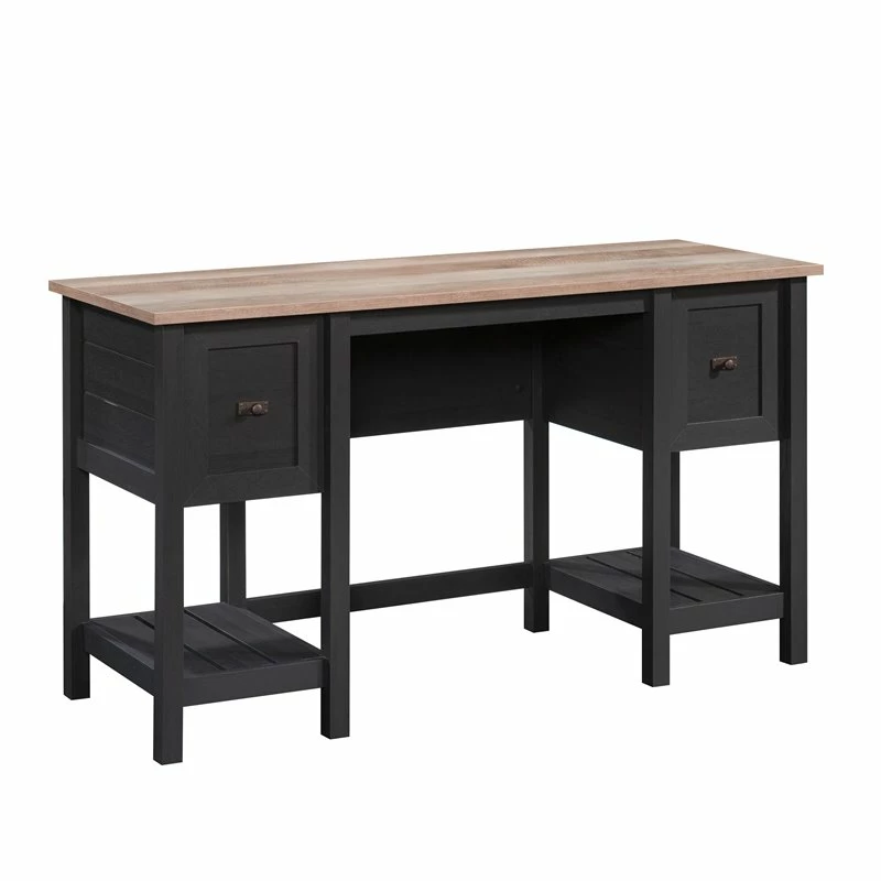 Transform your office space to a modern oasis with this desk from the Cottage Road® collection. The spacious table-top surface of this double pedestal desk offers ample amount of room for all your must-have office items – laptop, collection of notepads, a cup full of pens, and of course, your favorite coffee mug. This farmhouse pedestal desk features two spacious storage drawers that open and close on full extension slides for convenient storage of your office essentials. Keep all your important documents and papers organized in the file drawer that accommodates letter-size hanging files. This beautiful home office desk with drawers also includes two lower open shelves for additional storage of organizing bins or books. We have made assembly as easy as possible: This home office desk with storage features a T-slot assembly system and slide-on moldings because we know your time is valuable. This modern farmhouse desk is finished on all sides for versatile display and features a Soft White® finish with a Lintel Oak® accent. This home office desk with storage will have you feeling motivated and ready to work!